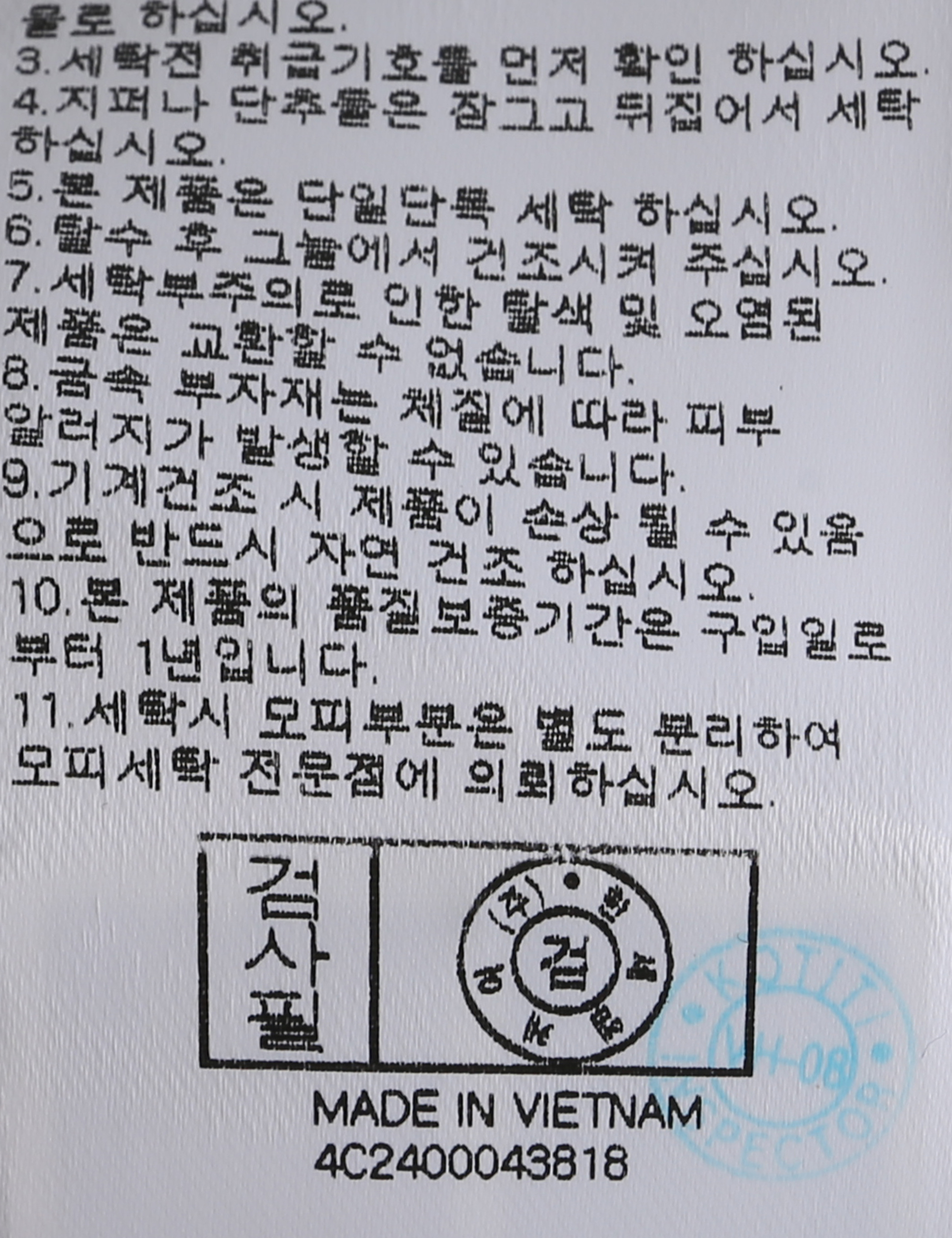 | 세탁방법 및 취급시 주의사항 | 본 제품은 손세탁 하십시오.(케어라벨참고) |