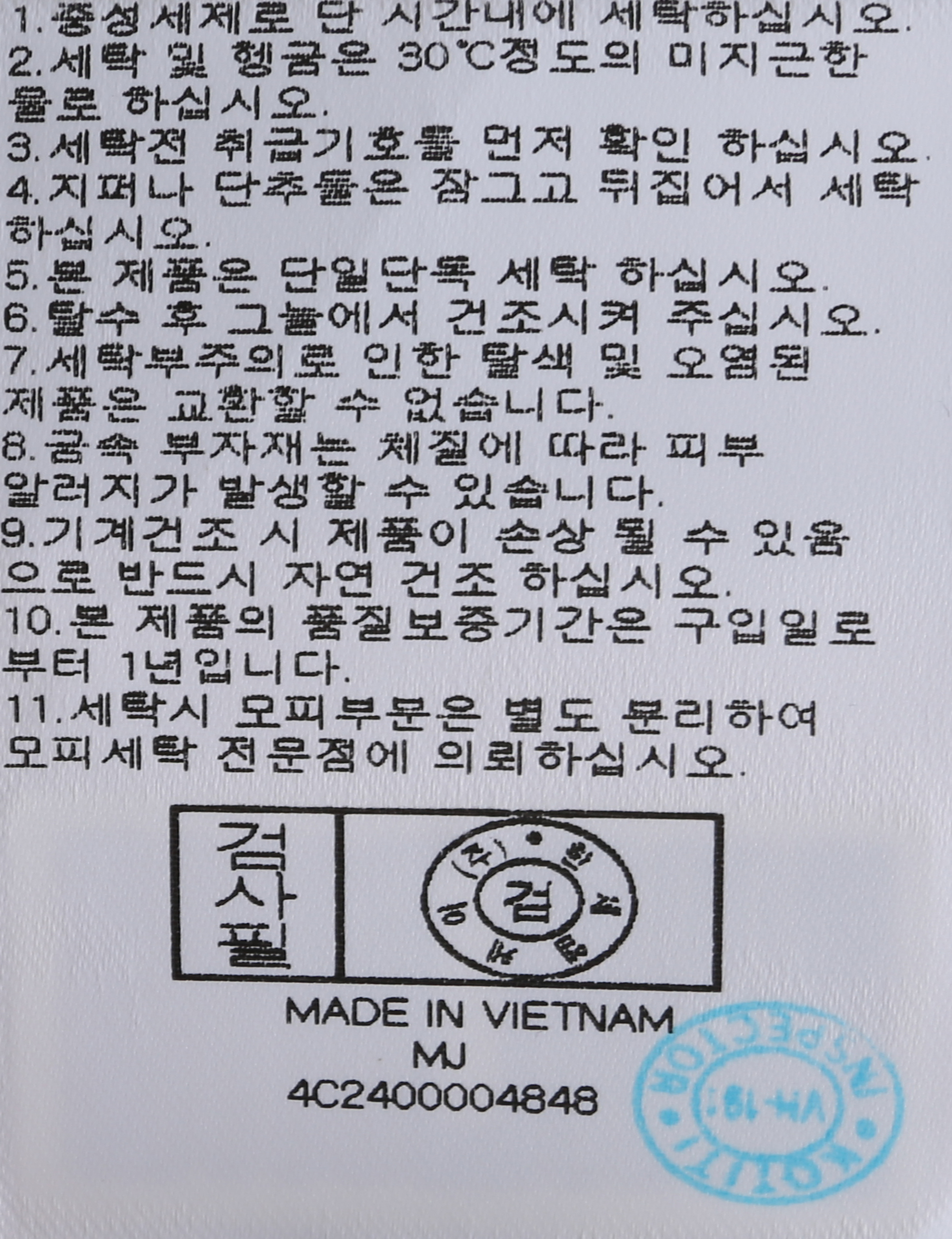 | 세탁방법 및 취급시 주의사항 | 본 제품은 손세탁 하십시오.(케어라벨참고) |