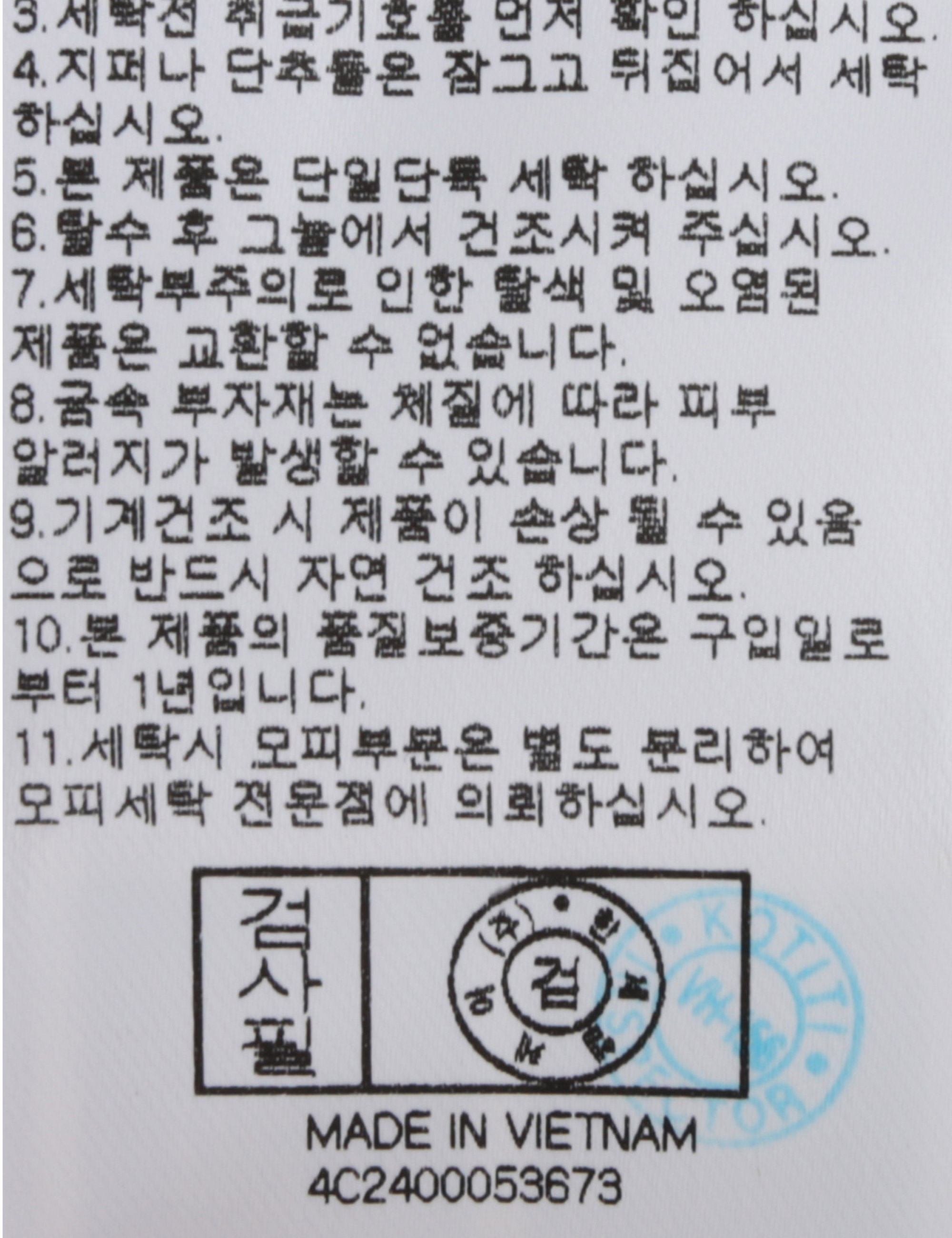 | 세탁방법 및 취급시 주의사항 | 본 제품은 손세탁 하십시오.(케어라벨참고) |
