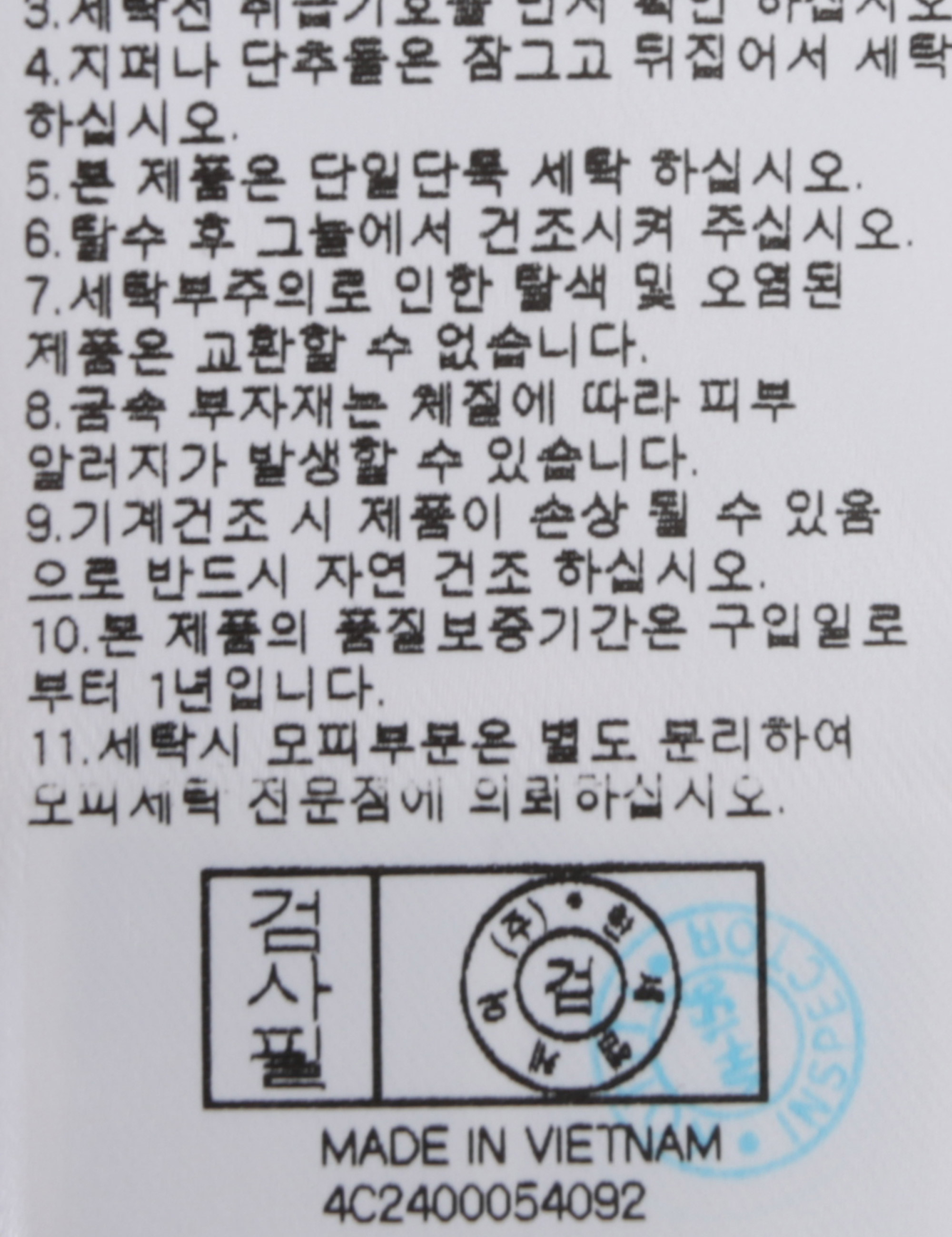 | 세탁방법 및 취급시 주의사항 | 본 제품은 손세탁 하십시오.(케어라벨참고) |