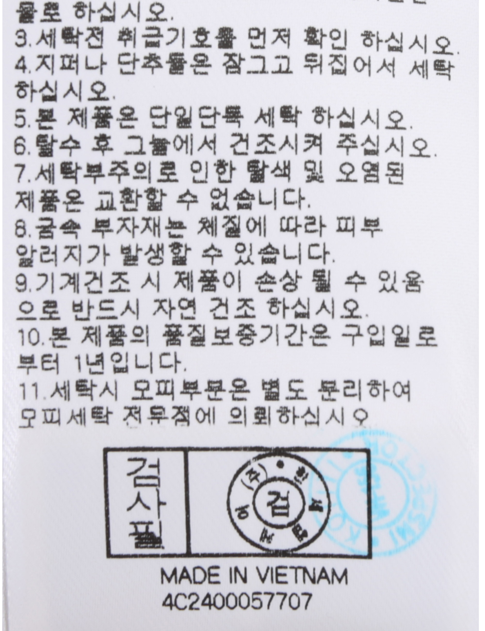 | 세탁방법 및 취급시 주의사항 | 본 제품은 손세탁 하십시오.(케어라벨참고) |