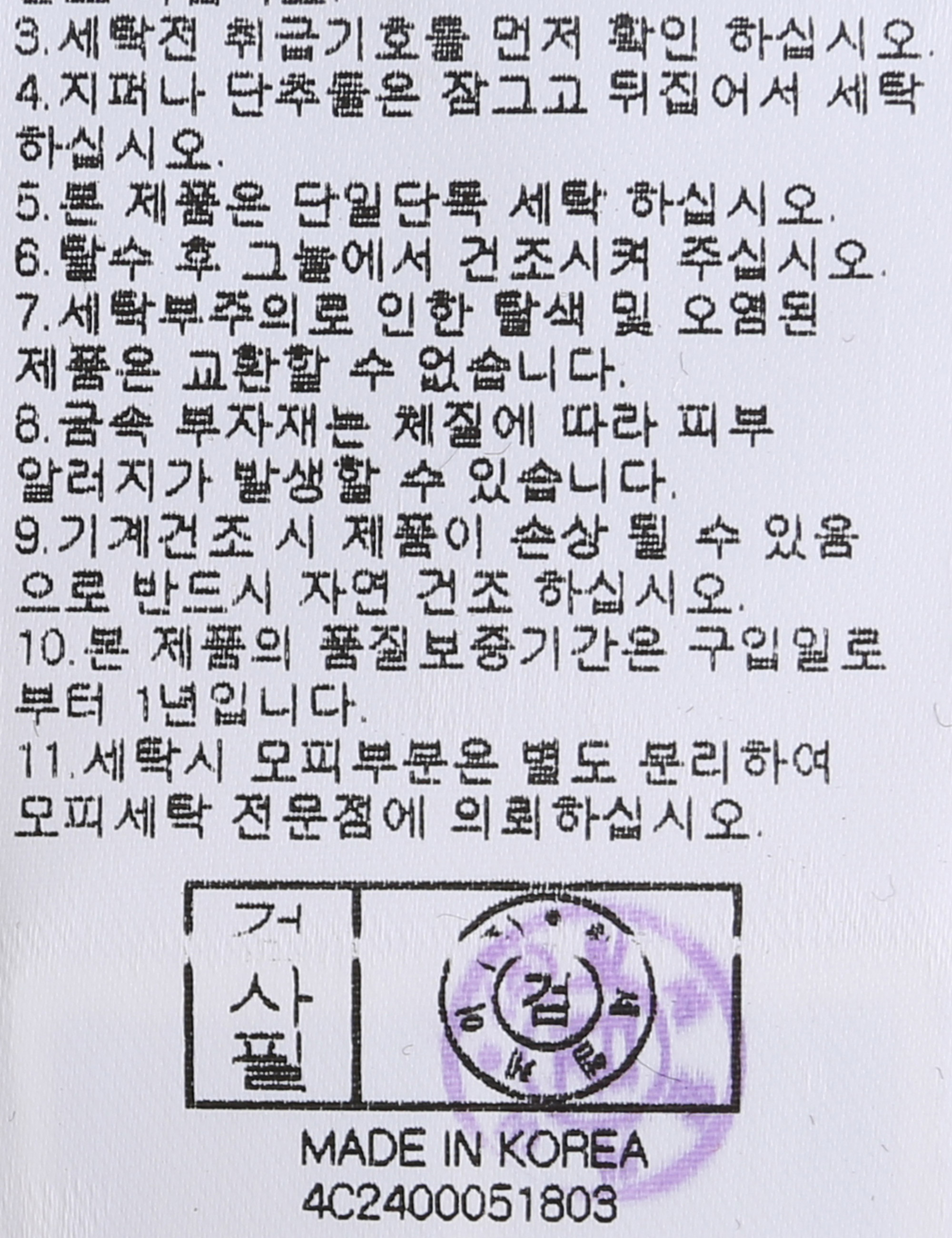 | 세탁방법 및 취급시 주의사항 | 본 제품은 손세탁 하십시오.(케어라벨참고) |