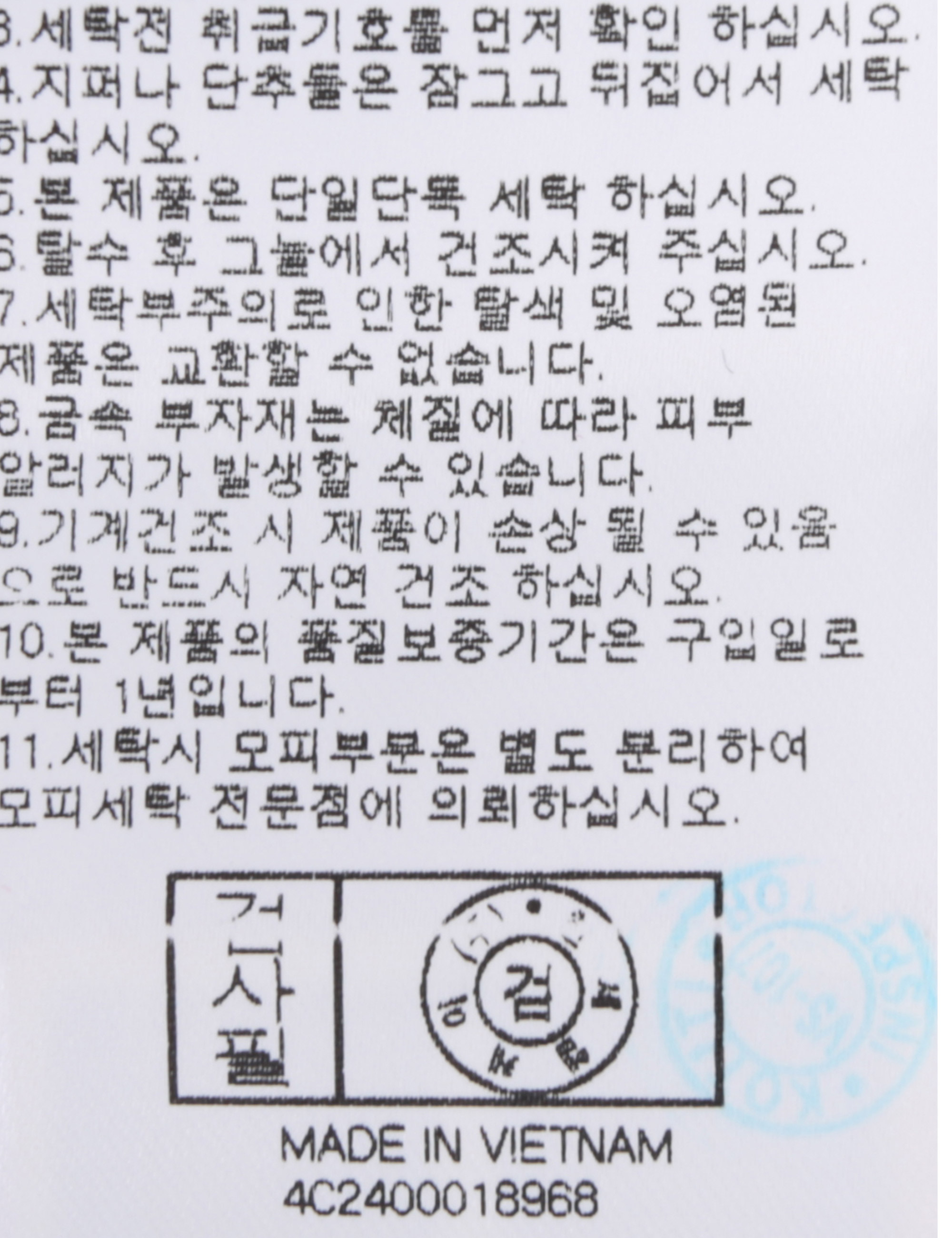 | 세탁방법 및 취급시 주의사항 | 본 제품은 손세탁 하십시오.(케어라벨참고) |