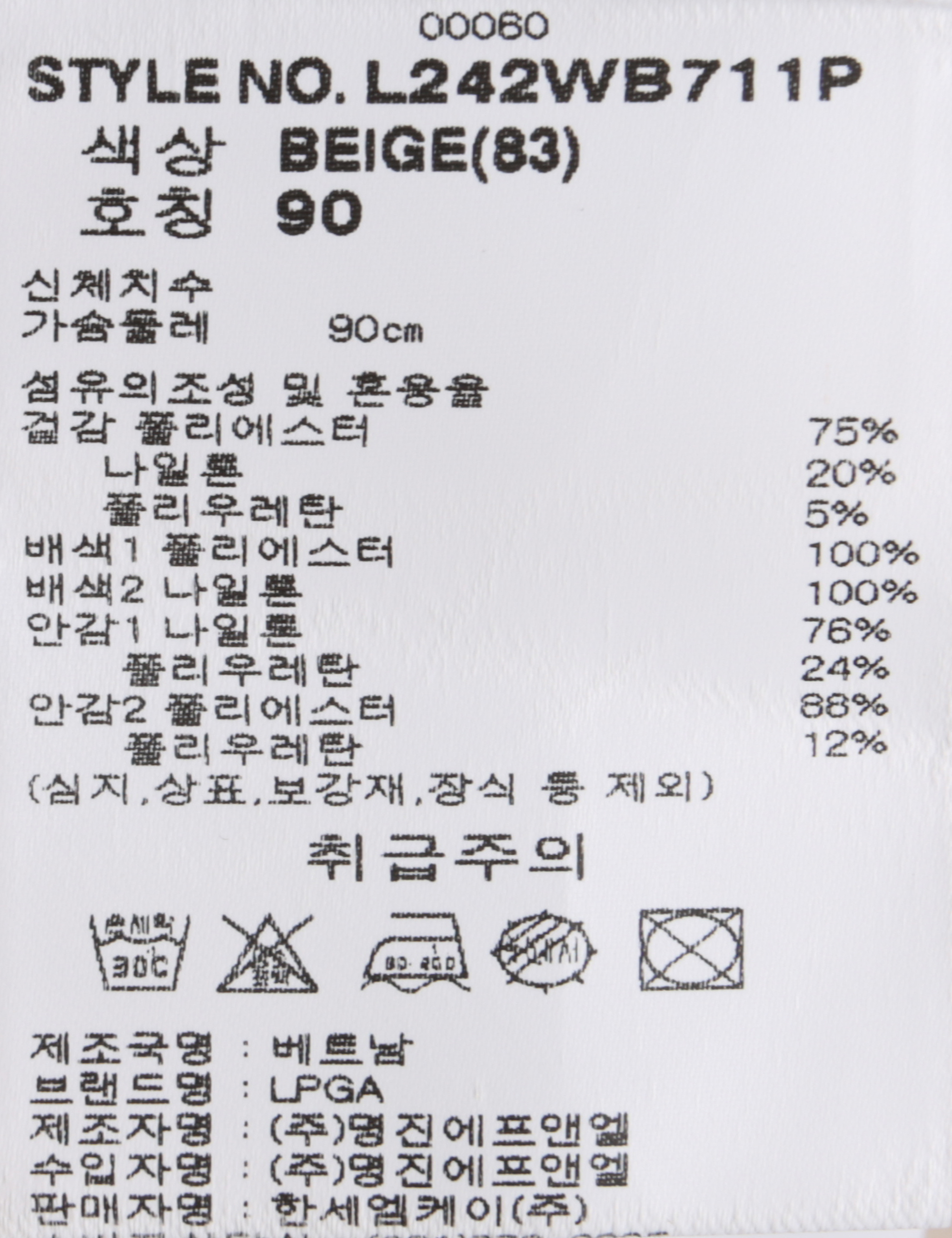 제품소재 [겉감]폴리에스터75% 나일론20% 폴리우레탄5% [배색1]폴리에스터100% [배색2]나일론100% [안감1]나일론76% 폴리우레탄24% [안감2]폴리에스터88% 폴리우레탄12%