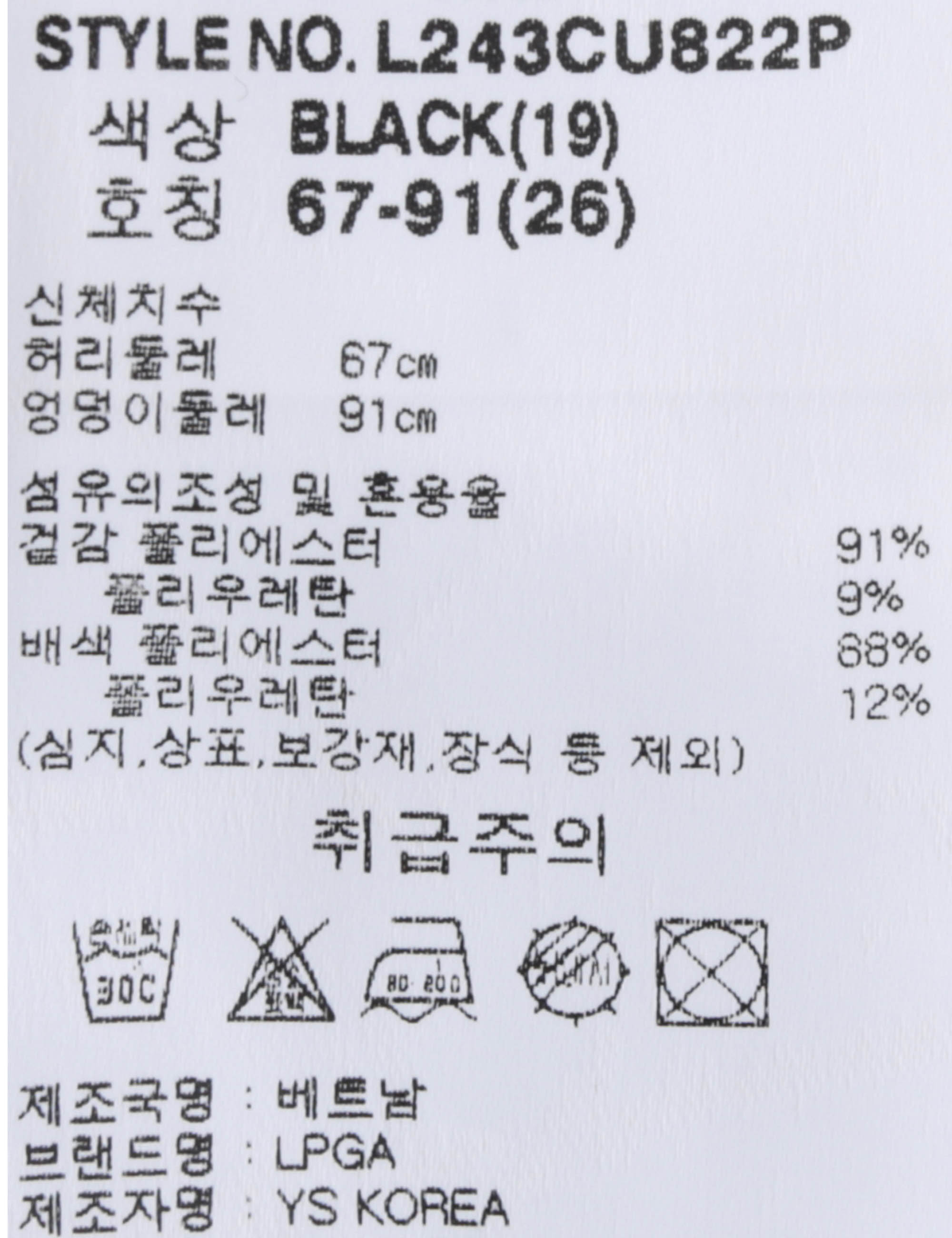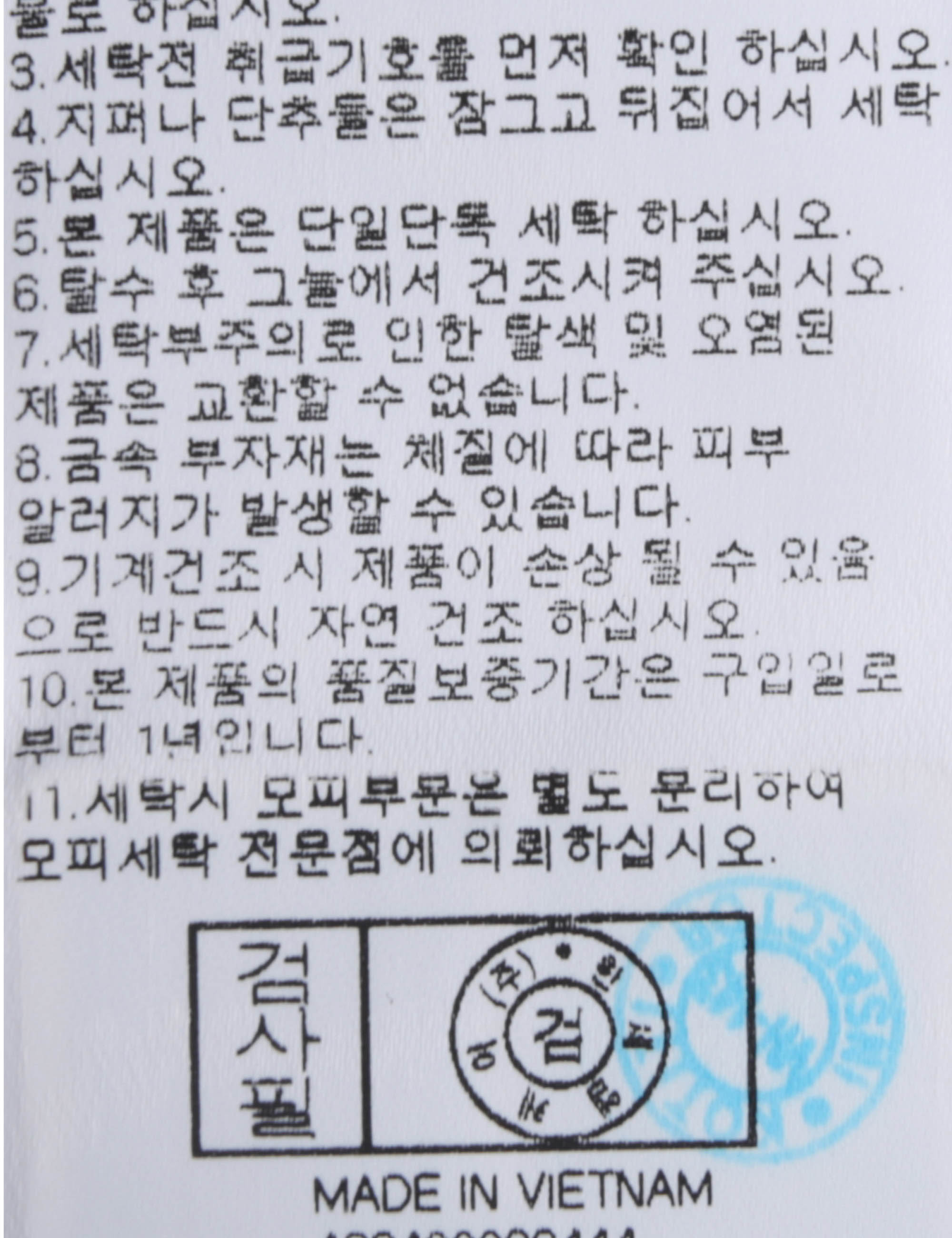 | 세탁방법 및 취급시 주의사항 | 본 제품은 손세탁 하십시오.(케어라벨참고) |