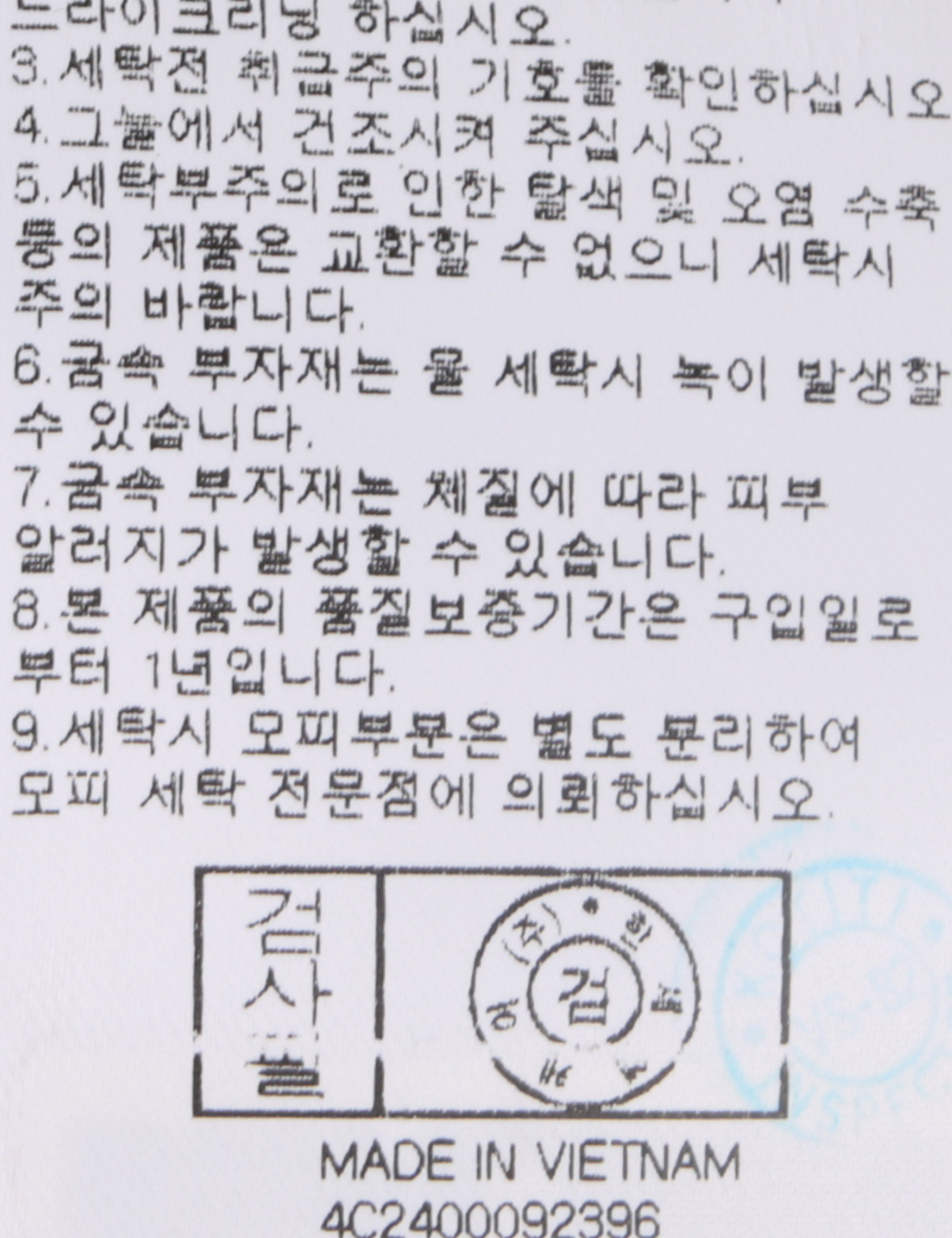 세탁방법 및 취급시 주의사항 본 제품은 반드시 드라이크리닝 하십시오.(세탁라벨참고)