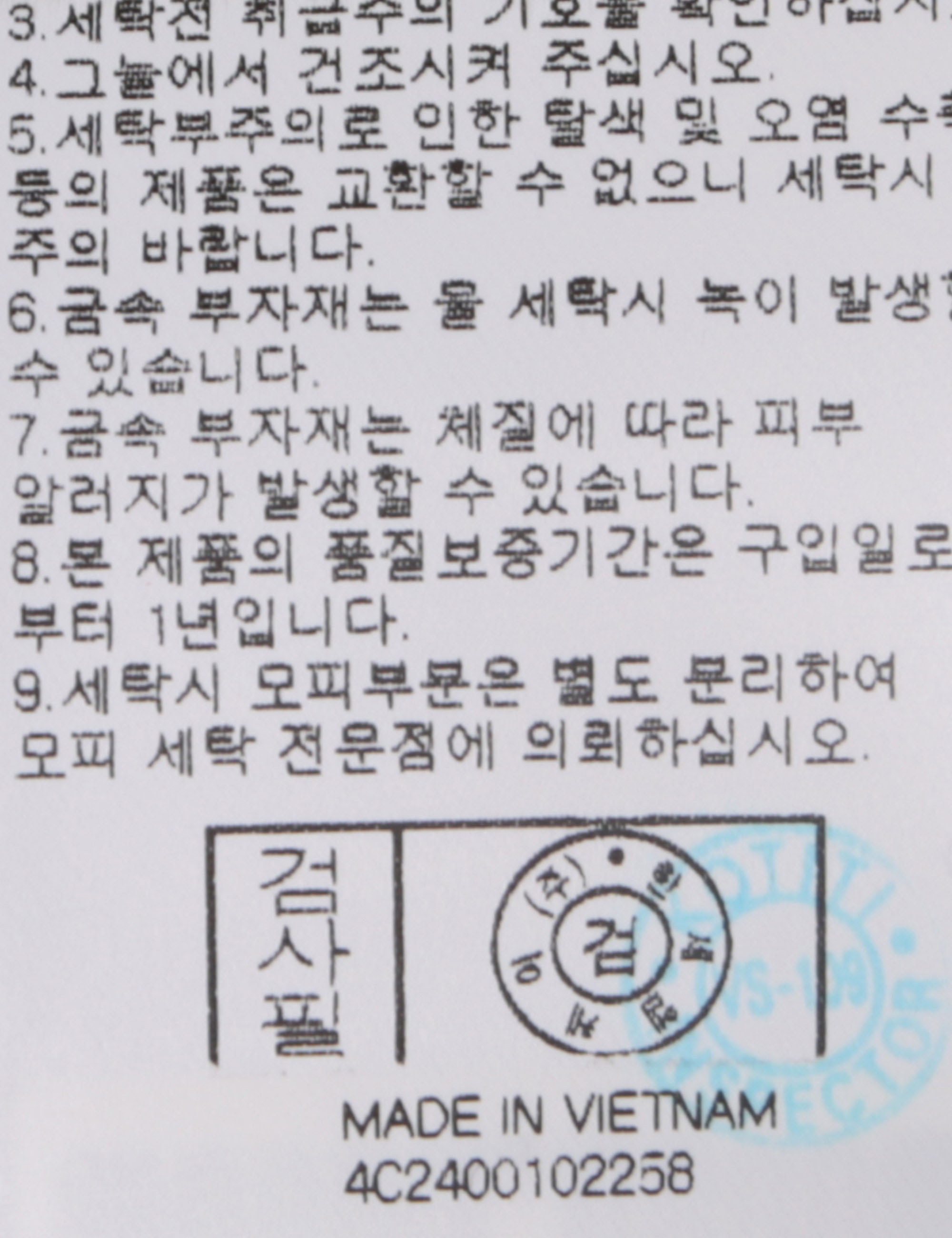| 세탁방법 및 취급시 주의사항 | 본 제품은 반드시 드라이크리닝 하십시오.(세탁라벨참고) |