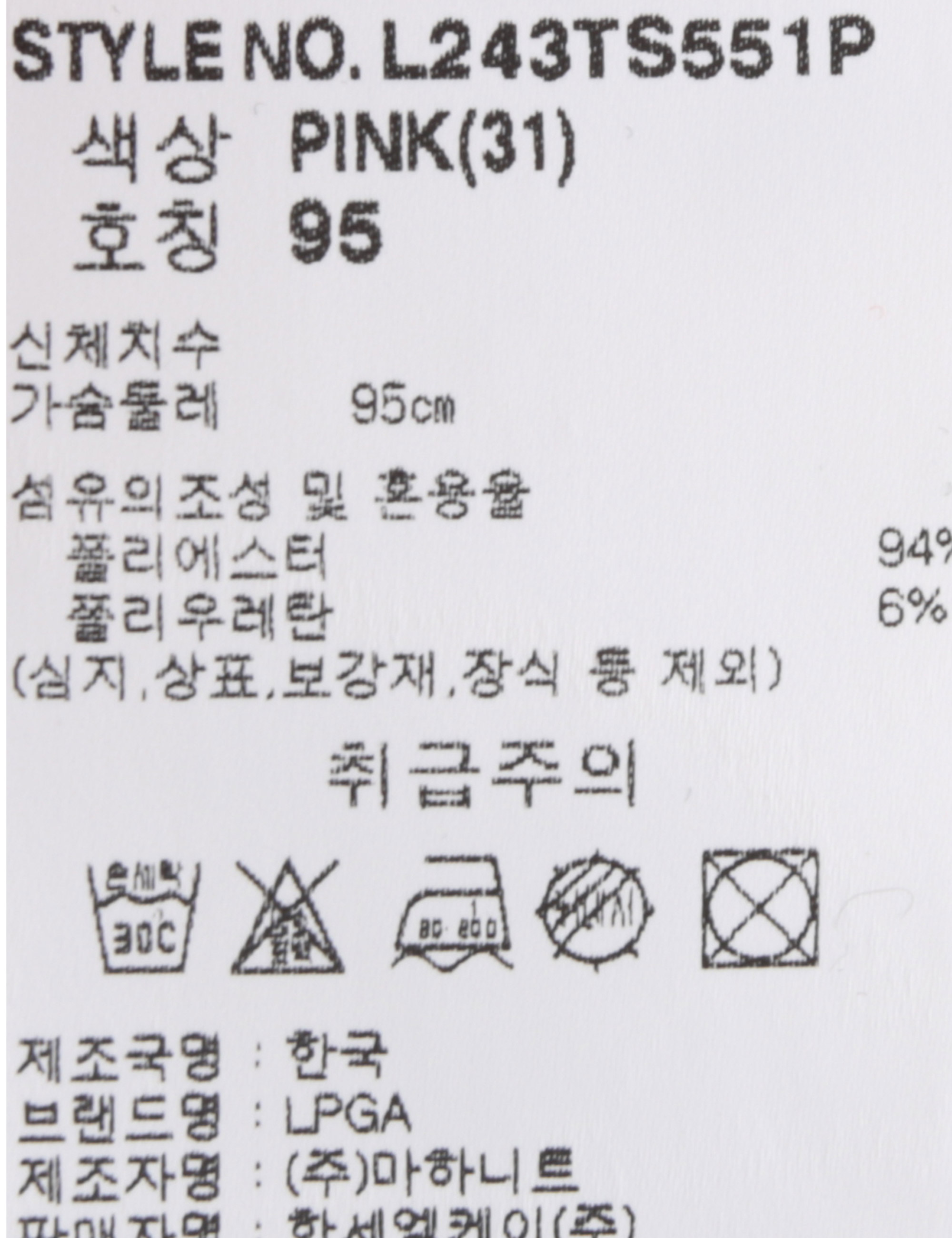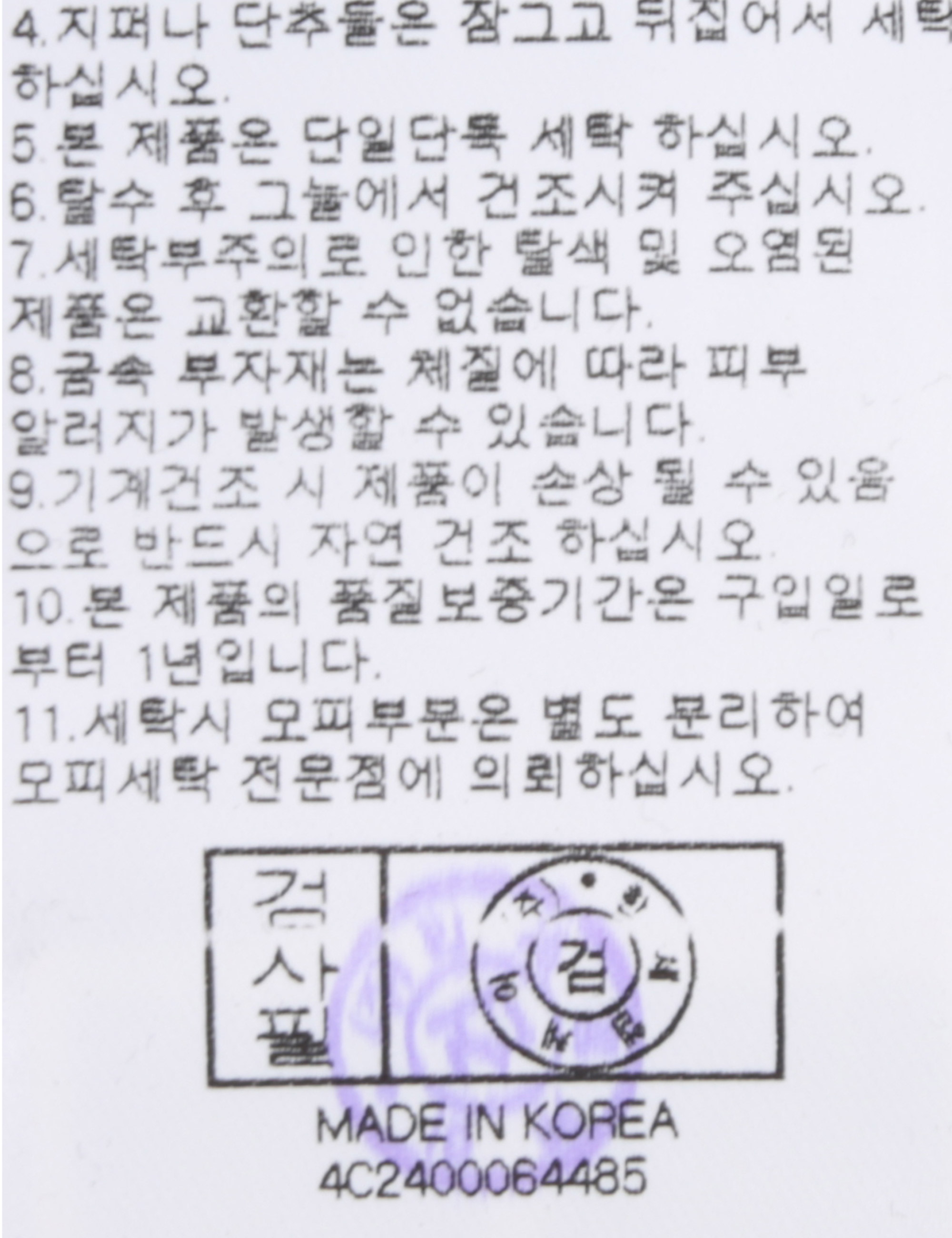 | 세탁방법 및 취급시 주의사항 | 본 제품은 손세탁 하십시오.(케어라벨참고) |