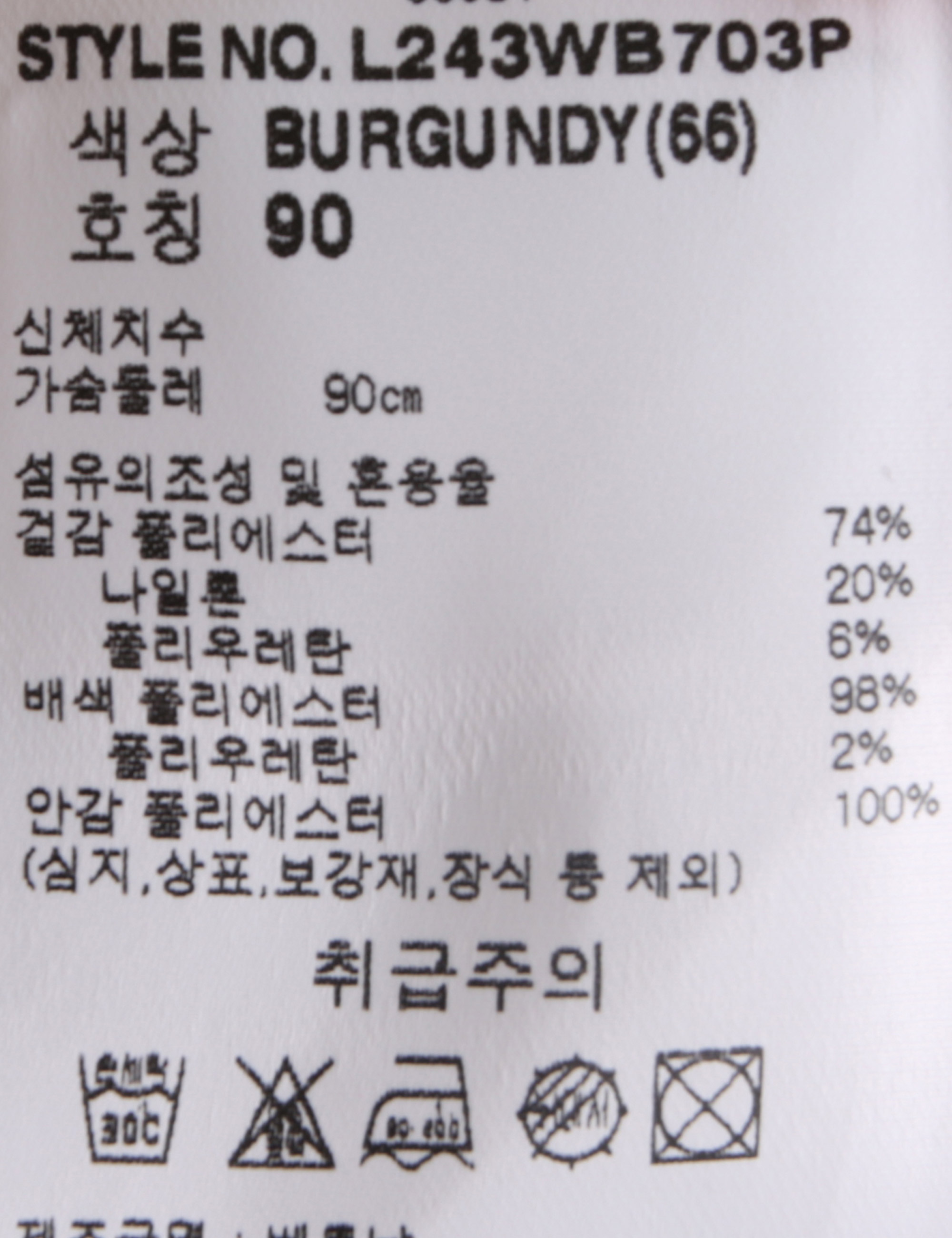 제품소재 [겉감]폴리에스터74% 나일론20% 폴리우레탄6% [배색]폴리에스터98% 폴리우레탄2% [안감]폴리에스터100%