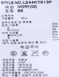 제품소재 [겉감]나일론55% 모40% 캐시미어5% [배색]아크릴45% 폴리에스터30% 모25% [안감]나일론100%