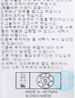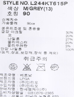 | 세탁방법 및 취급시 주의사항 | 본 제품은 반드시 드라이크리닝 하십시오.(세탁라벨참고) |