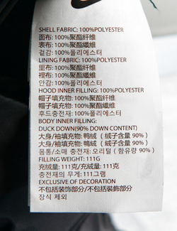 브랜드 홈 바로가기| 제품소재 | (겉감/안감/후드충전재)폴리에스터100%(몸통/소매 충전재)오리털(함유량90%) |