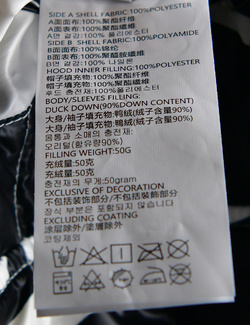 브랜드 홈 바로가기| 제품소재 | (A면 겉감/후충전재)폴리에스터100%(B면 겉감)나일론100%(몸통/소매 충전재)오리털(함유량90%) |