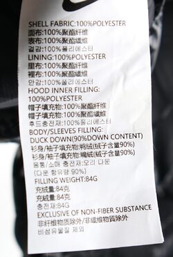 제품소재 (겉감/안감/후드충전재)폴리에스터100%(몸통/소매 충전재)오리다운(다운함유량90%)