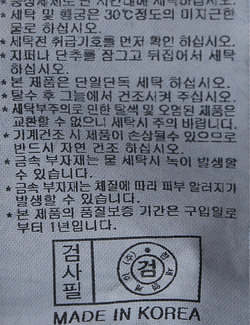 | 세탁방법 및 취급시 주의사항 | 중성세제로 단 시간내에 세탁하십시오.(케어라벨참고) |