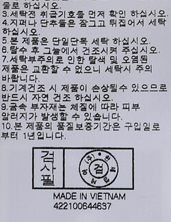 | 세탁방법 및 취급시 주의사항 | 본 제품은 단일단독 세탁하십시오. (세탁라벨참고) |