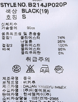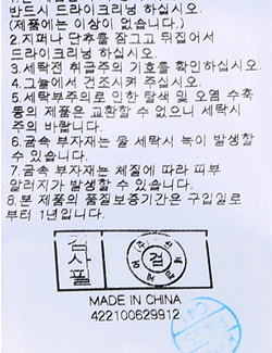 | 세탁방법 및 취급시 주의사항 | 본 제품은 반드시 드라이크리닝 하십시오.(세탁라벨참고) |