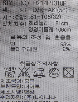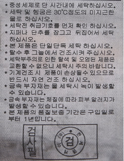| 세탁방법 및 취급시 주의사항 | 본 제품은 손세탁 하십시오.(케어라벨참고) |