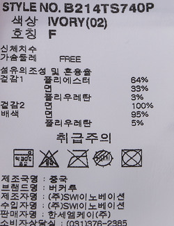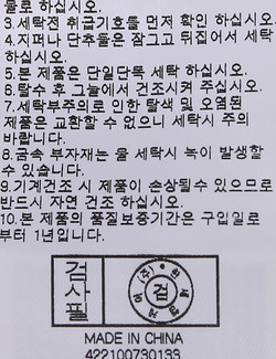 | 세탁방법 및 취급시 주의사항 | 중성세제로 단 시간내에 세탁하십시오.(케어라벨참고) |