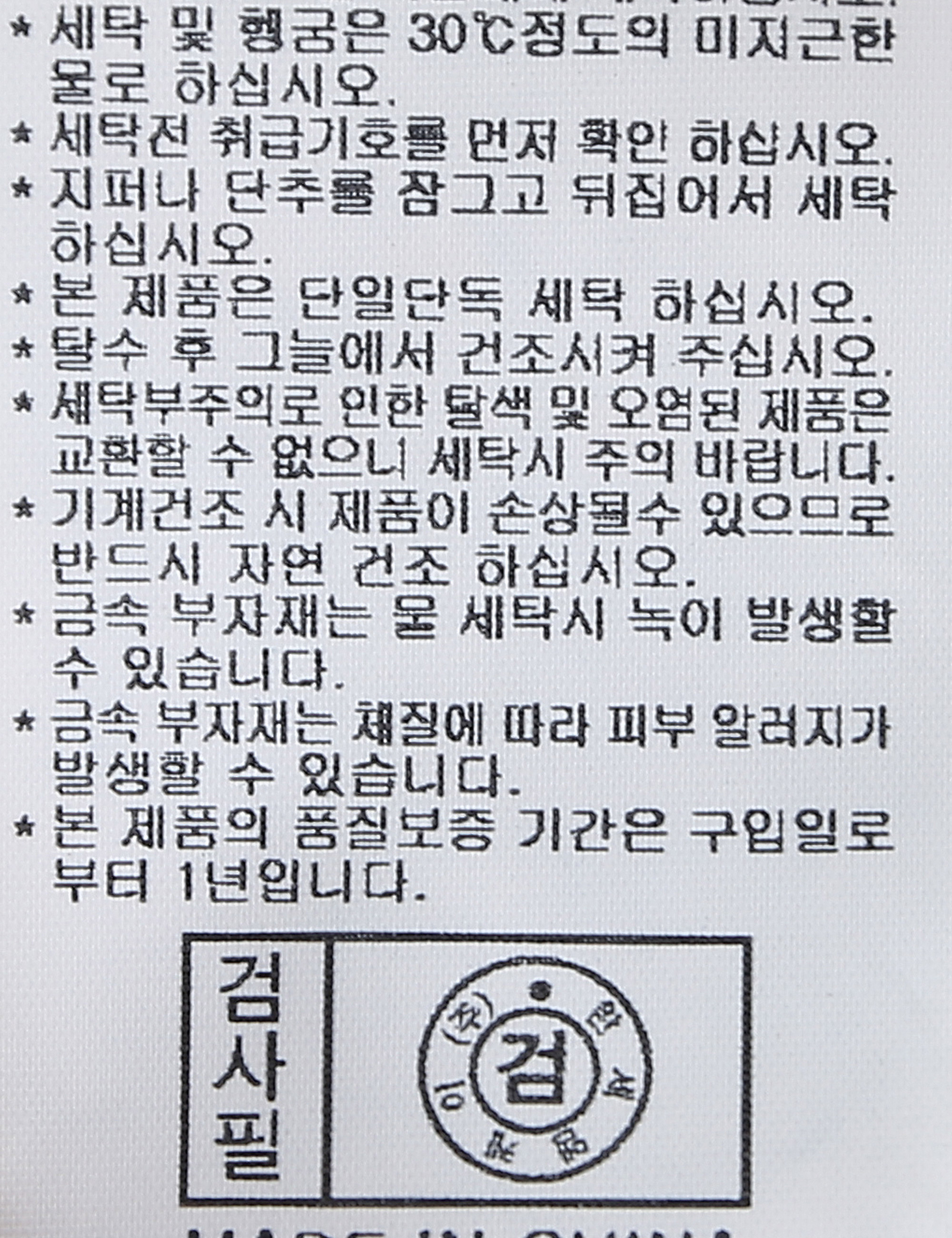 | 세탁방법 및 취급시 주의사항 | 중성세제로 단 시간내에 세탁하십시오.(케어라벨참고) |