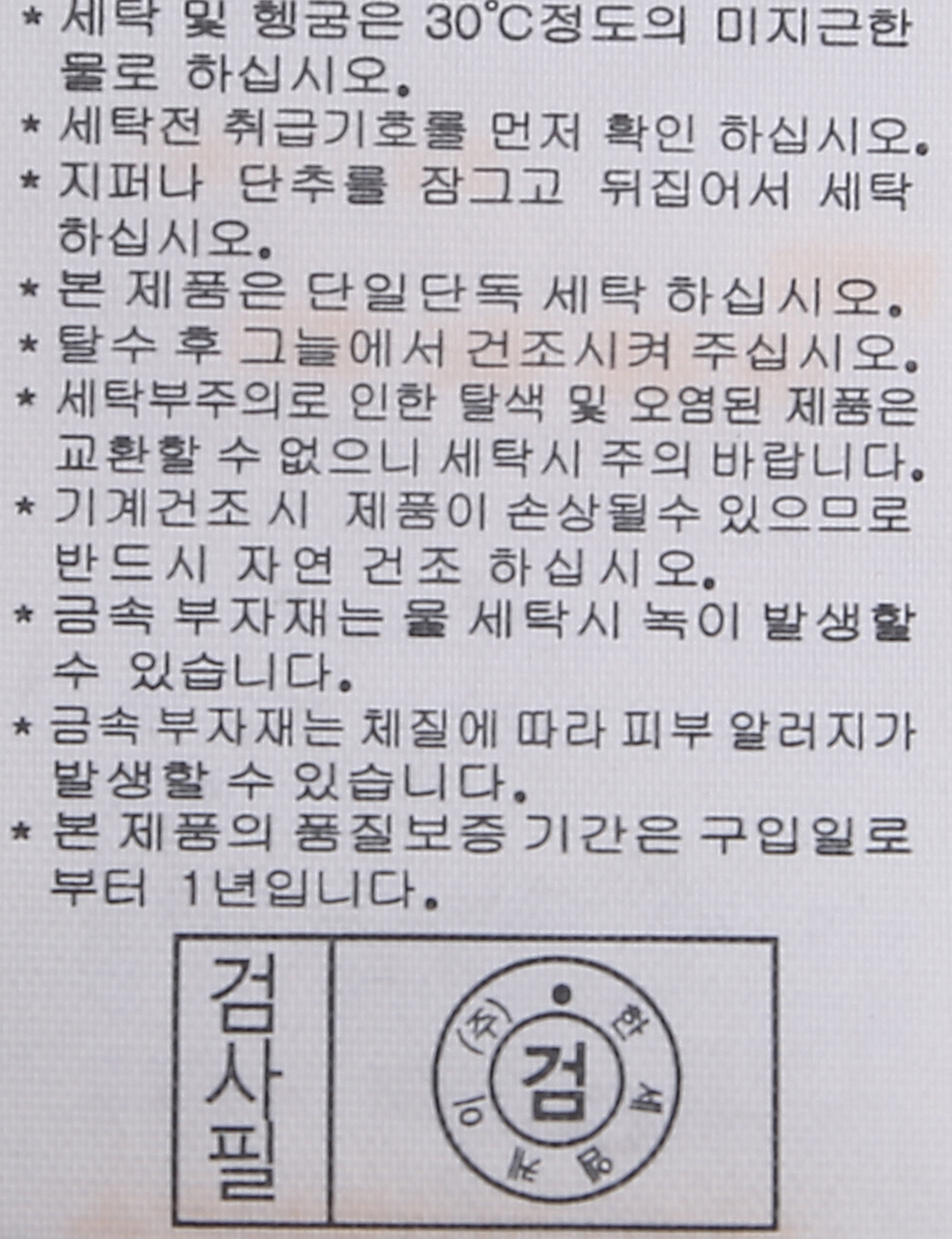 | 세탁방법 및 취급시 주의사항 | 본 제품은 손세탁 하십시오.(케어라벨참고) |
