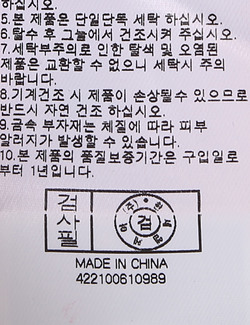 | 세탁방법 및 취급시 주의사항 | 중성세제로 단 시간내에 세탁하십시오.(케어라벨참고) |