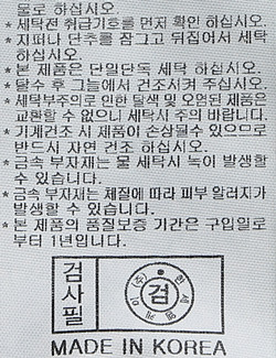 | 세탁방법 및 취급시 주의사항 | 중성세제로 단 시간내에 세탁하십시오.(케어라벨참고) |