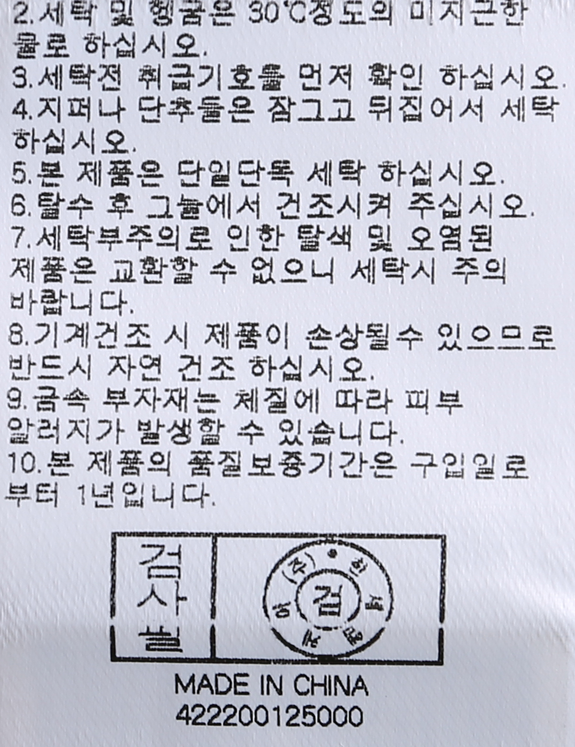 | 세탁방법 및 취급시 주의사항 | 중성세제로 단 시간내에 세탁하십시오.(케어라벨참고) |