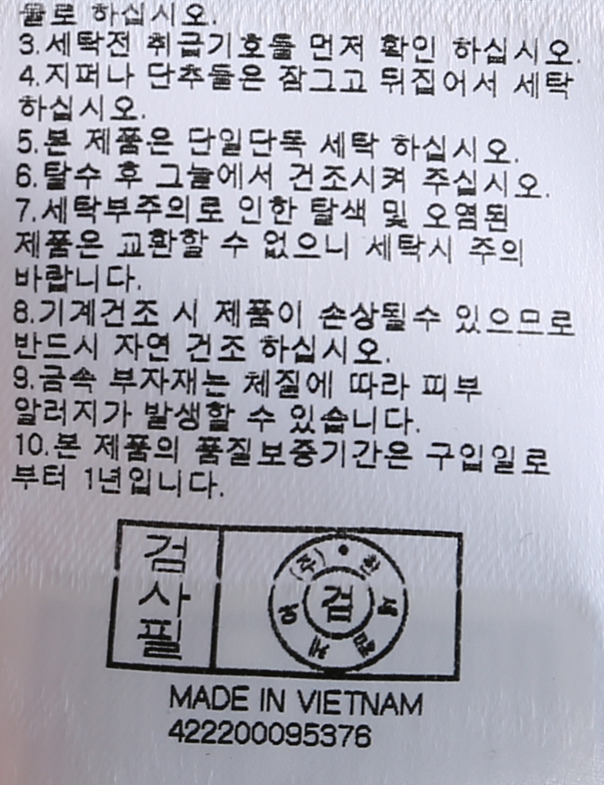 | 세탁방법 및 취급시 주의사항 | 중성세제로 단 시간내에 세탁하십시오.(케어라벨참고) |
