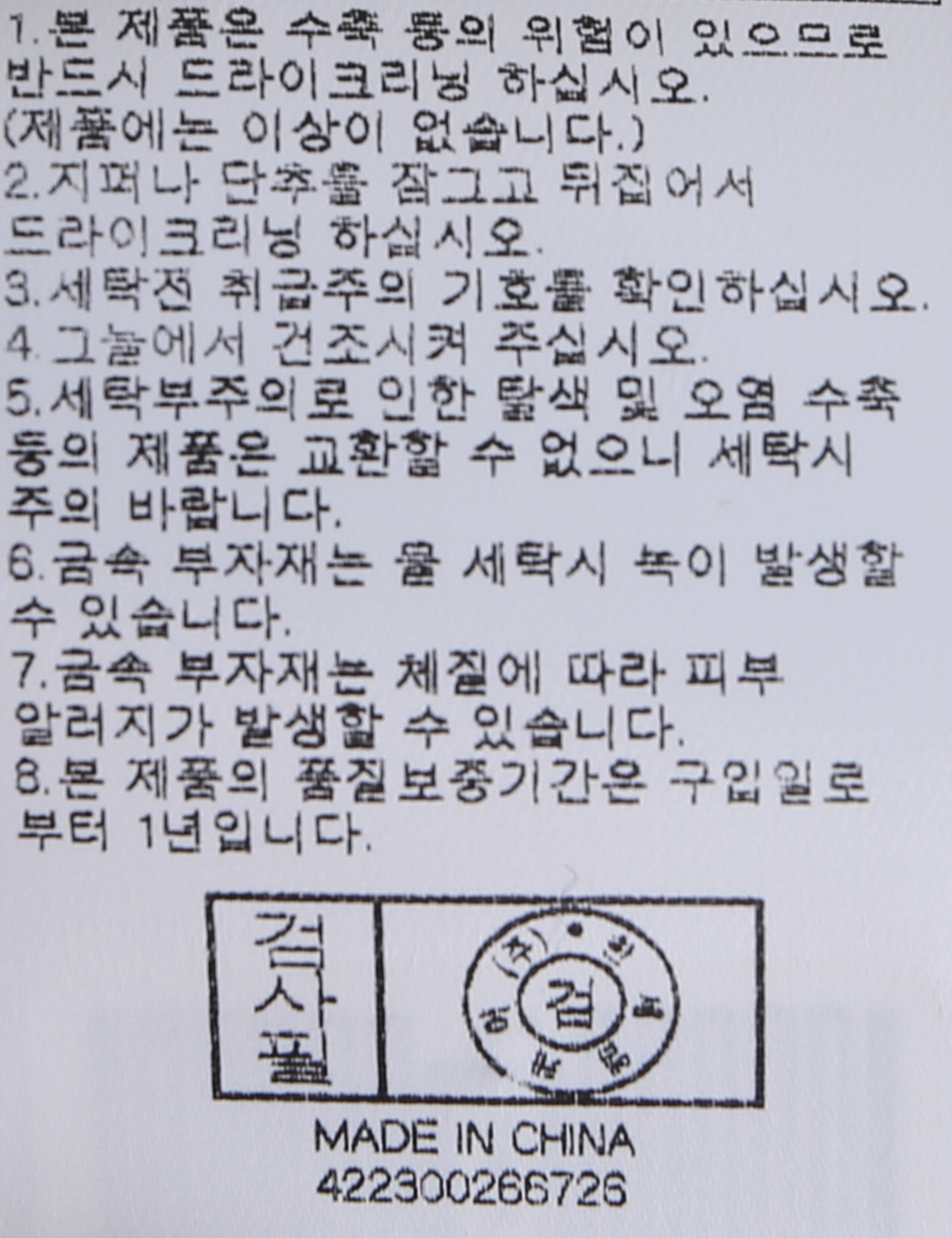 | 세탁방법 및 취급시 주의사항 | 본 제품은 반드시 드라이크리닝 하십시오.(세탁라벨참고) |