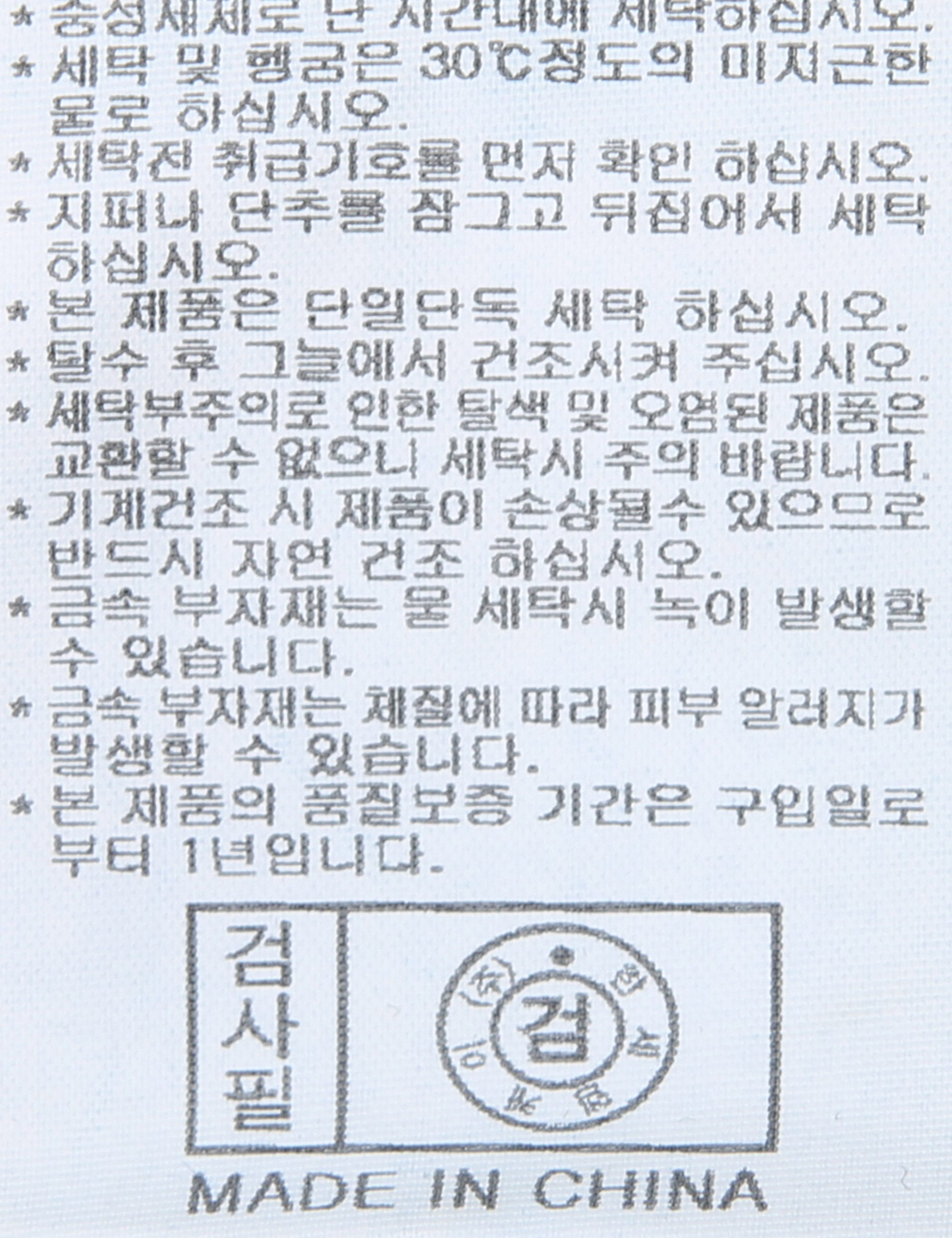 | 세탁방법 및 취급시 주의사항 | 중성세제로 단 시간내에 세탁하십시오.(케어라벨참고) |