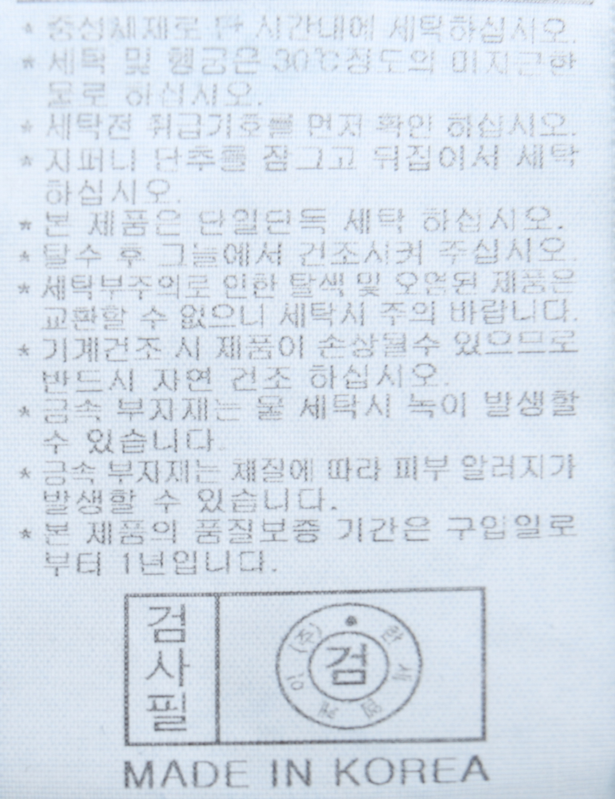 | 세탁방법 및 취급시 주의사항 | 중성세제로 단 시간내에 세탁하십시오.(케어라벨참고) |
