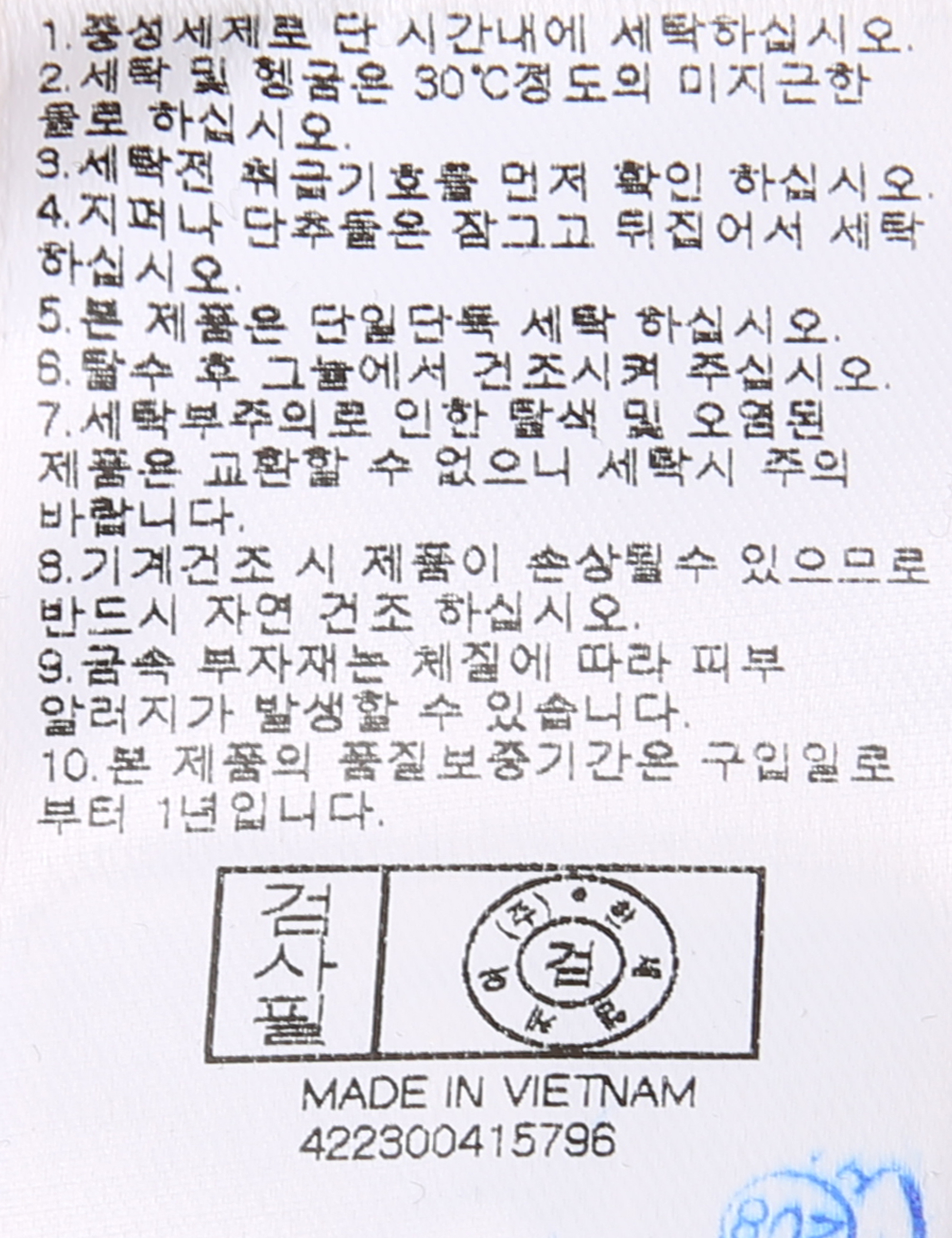 | 세탁방법 및 취급시 주의사항 | 중성세제로 단 시간내에 세탁하십시오.(케어라벨참고) |