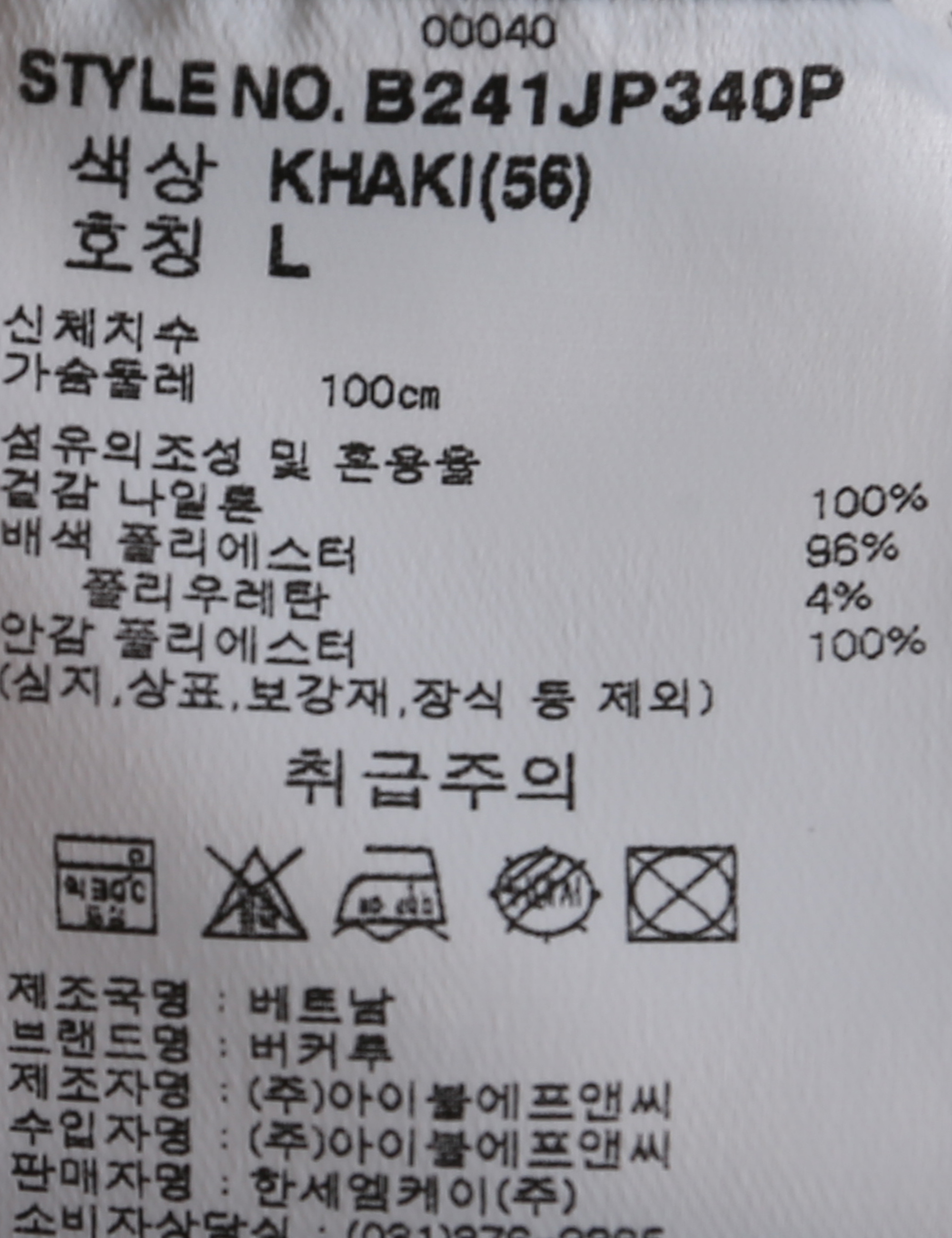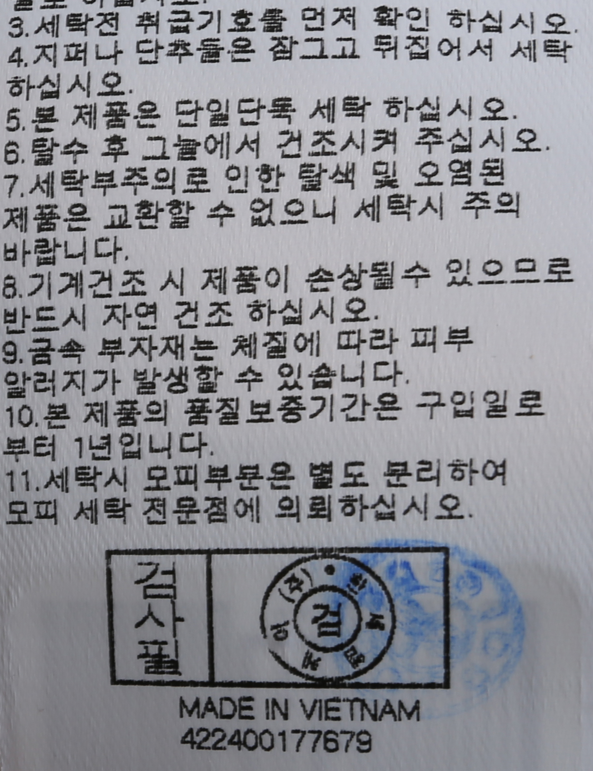 | 세탁방법 및 취급시 주의사항 | 중성세제로 단 시간내에 세탁하십시오.(케어라벨참고) |