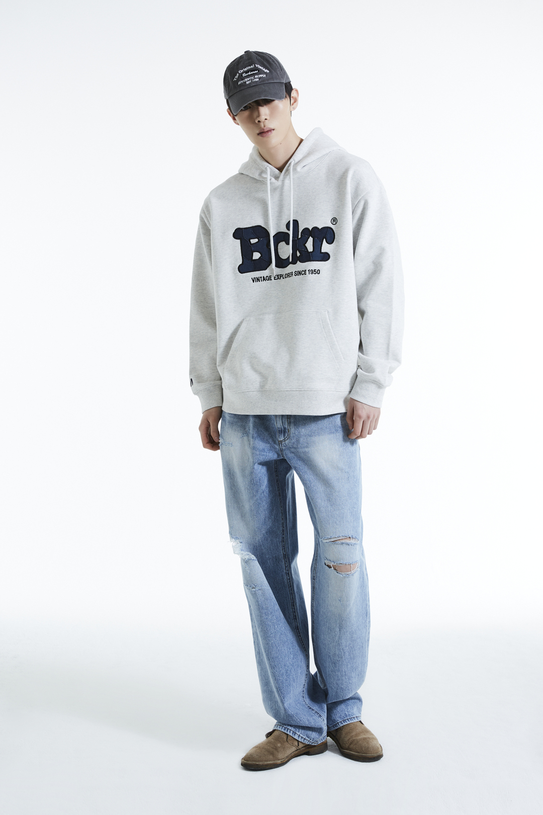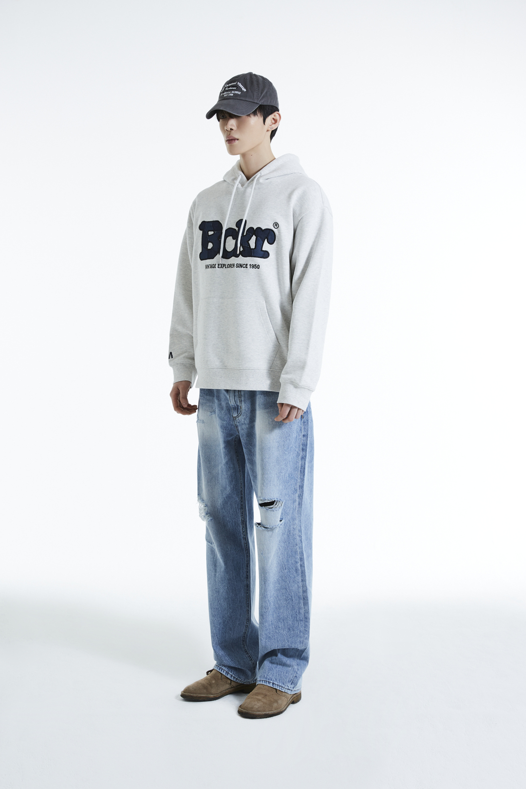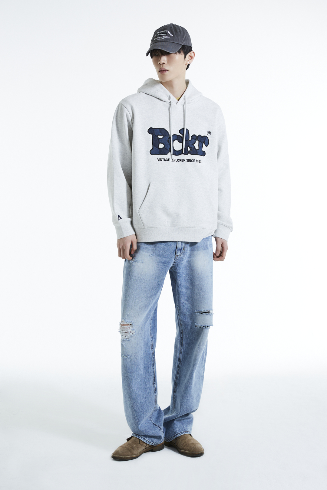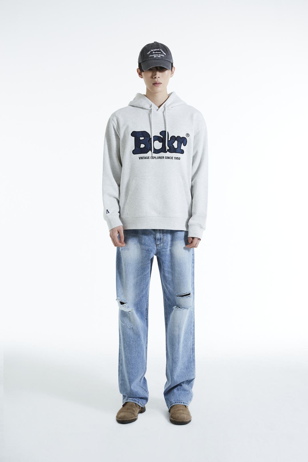 * 가볍고 안정적인 혼용률의 CP 소재에 데님 패치로 빈티지 디테일을 더한 버커루 전판 패치워크 후드티