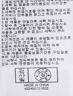 | 세탁방법 및 취급시 주의사항 | 중성세제로 단 시간내에 세탁하십시오.(케어라벨참고) |