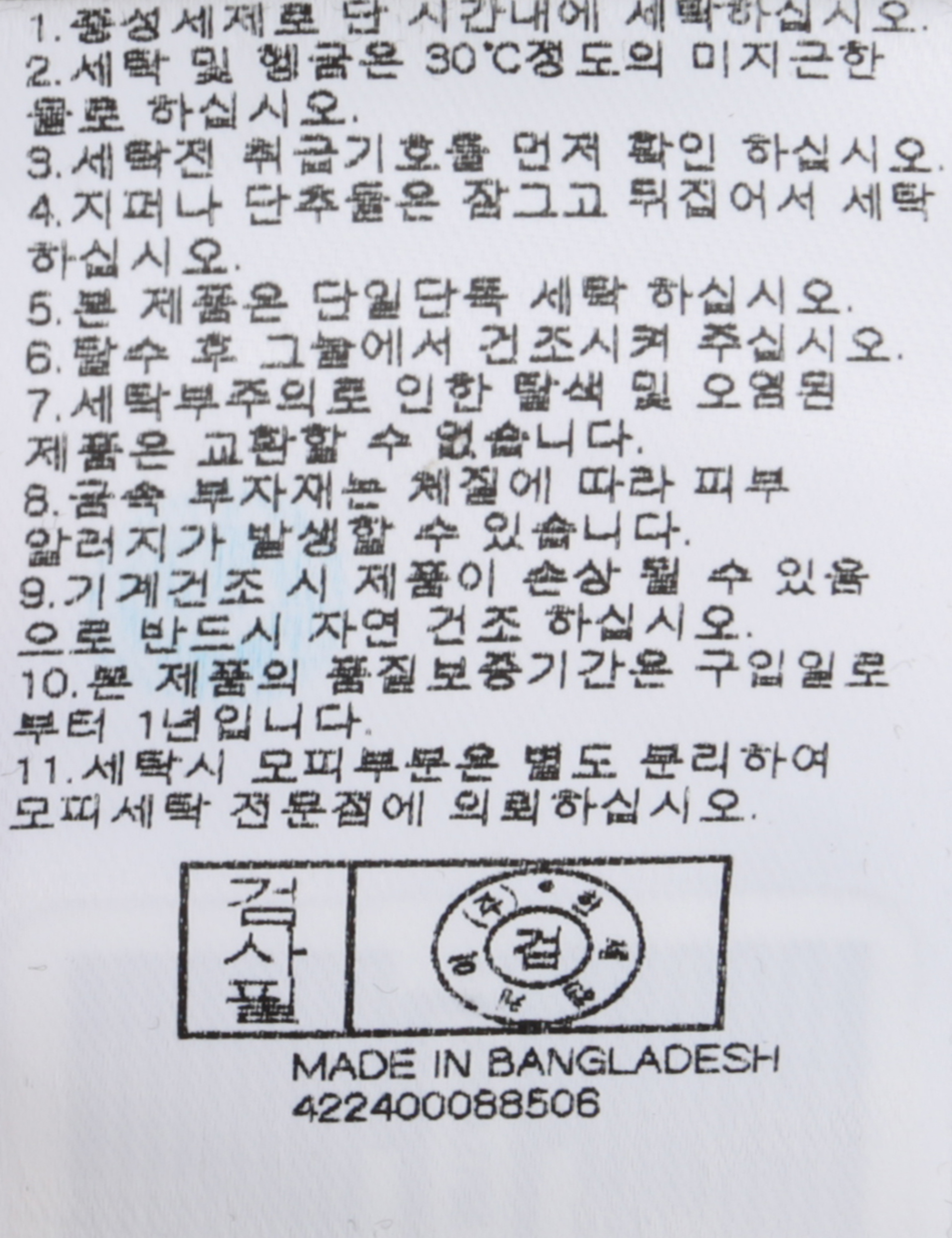 | 세탁방법 및 취급시 주의사항 | 본 제품은 손세탁 하십시오.(케어라벨참고) |