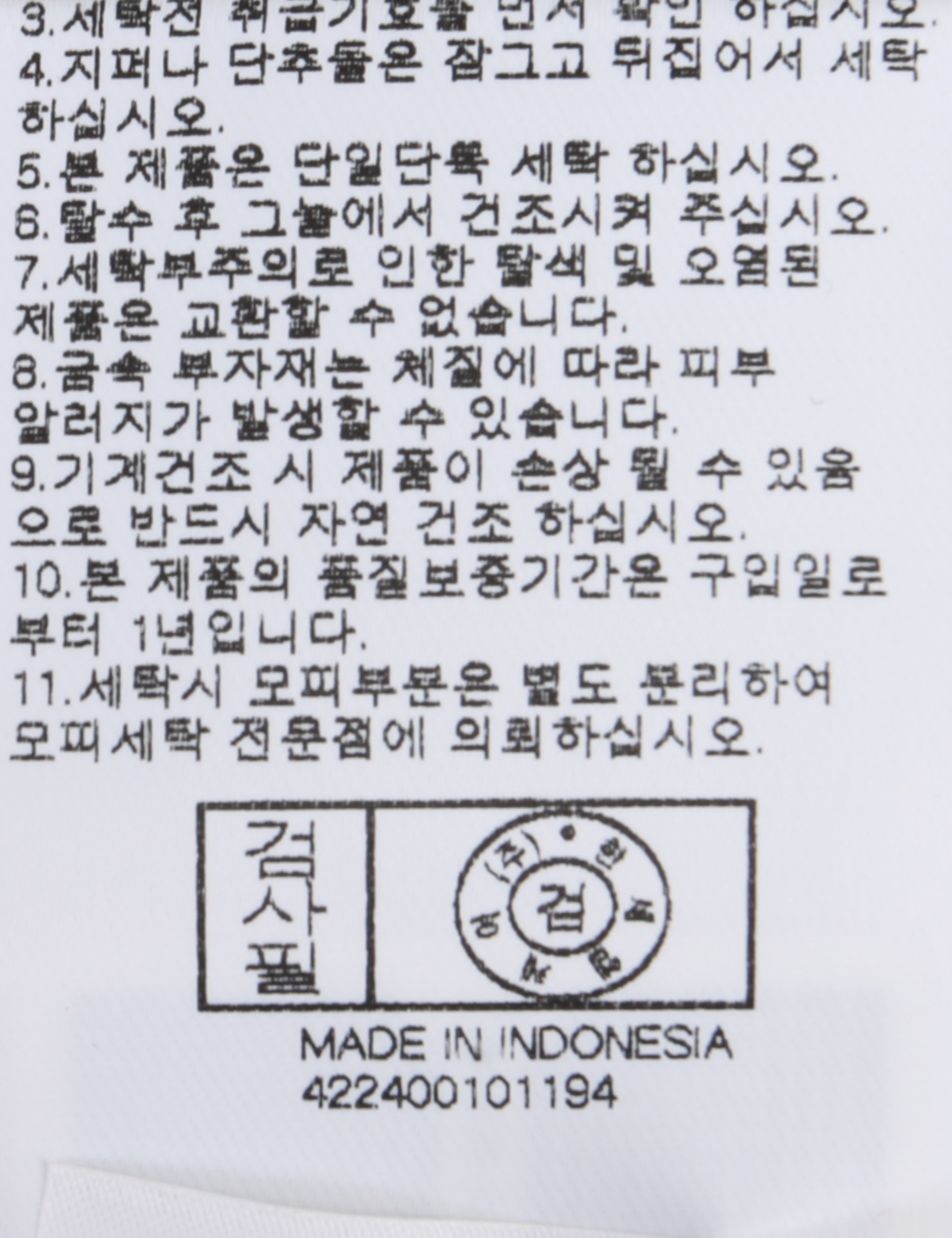 | 세탁방법 및 취급시 주의사항 | 본 제품은 손세탁 하십시오.(케어라벨참고) |