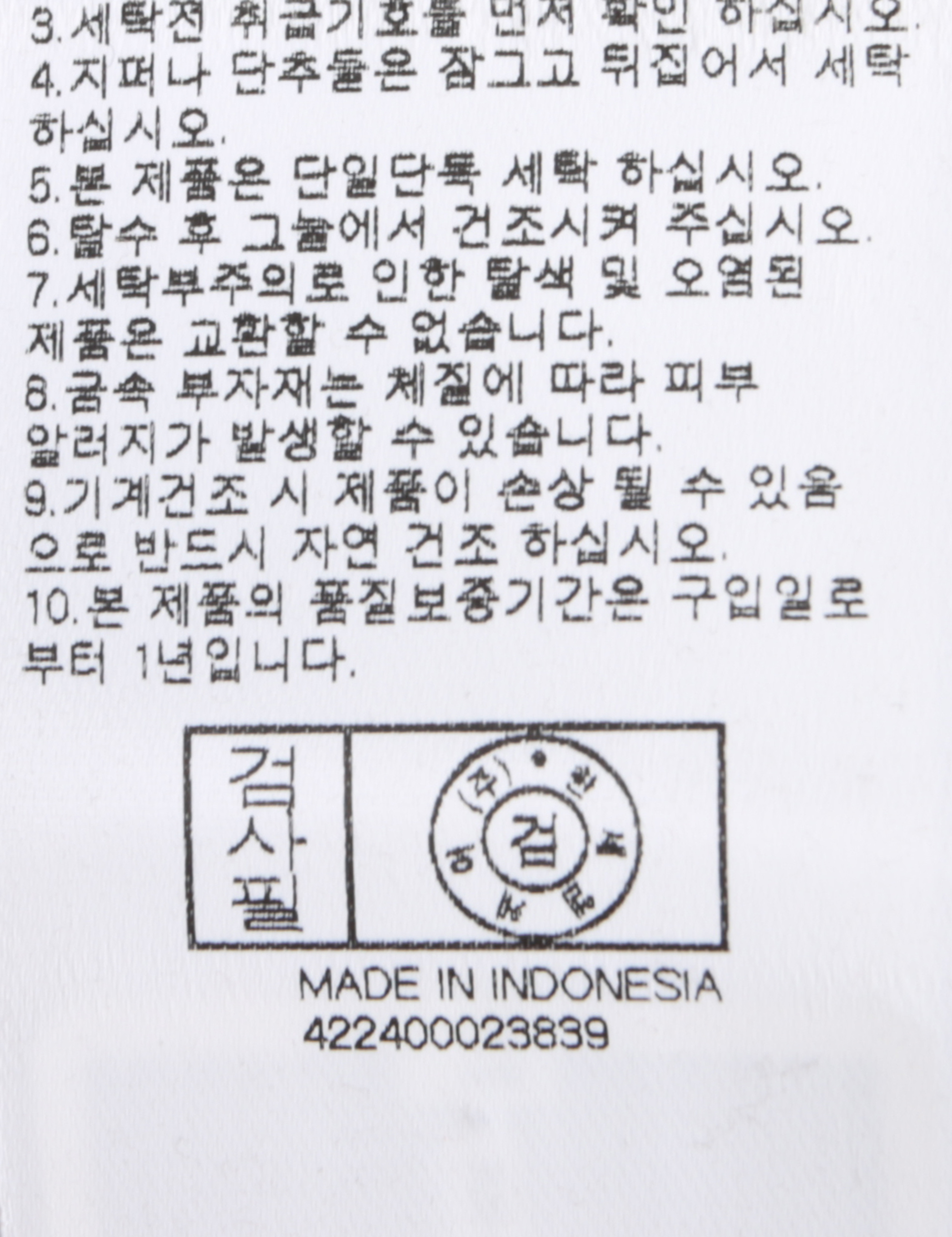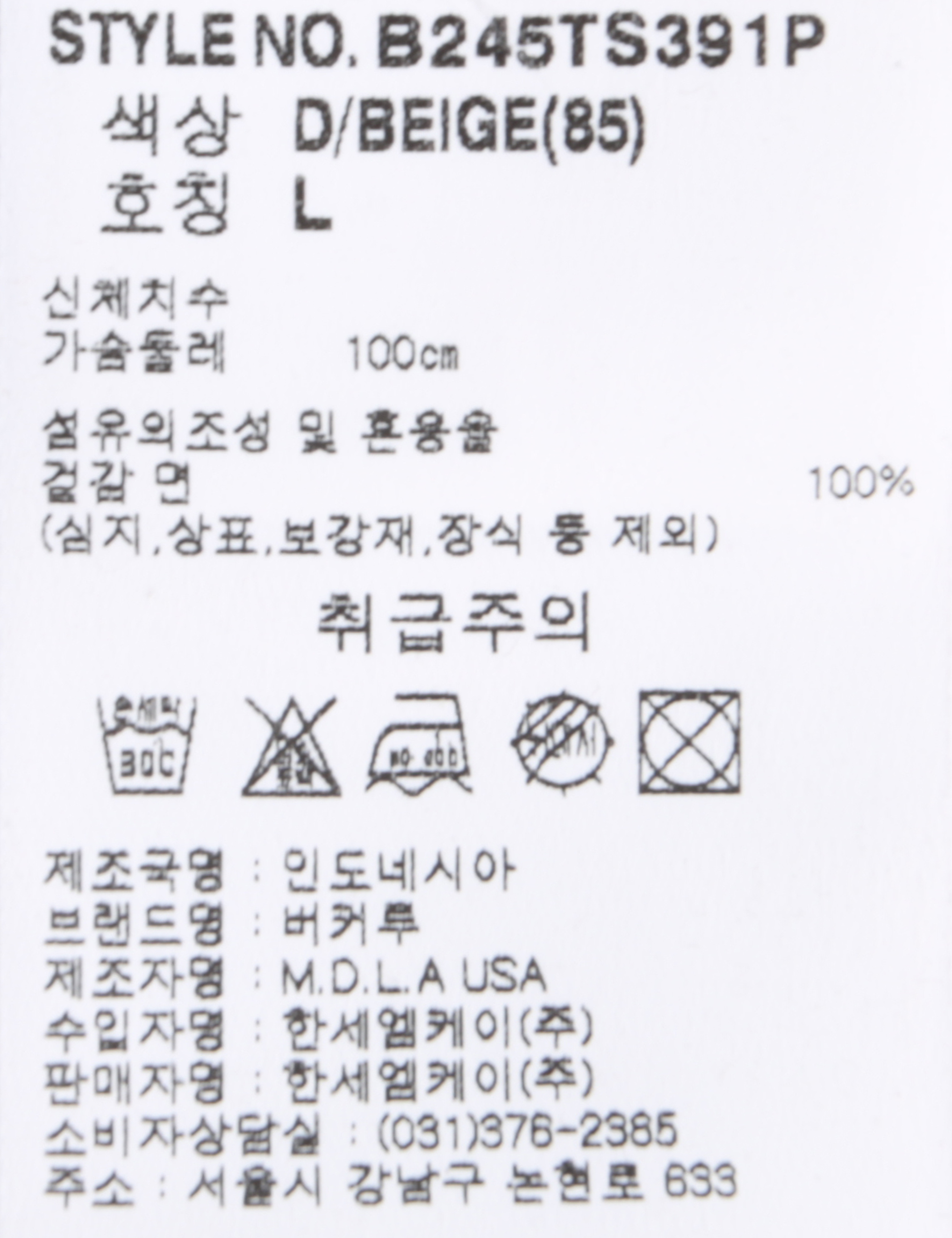 | 세탁방법 및 취급시 주의사항 | 본 제품은 손세탁 하십시오.(케어라벨참고) |