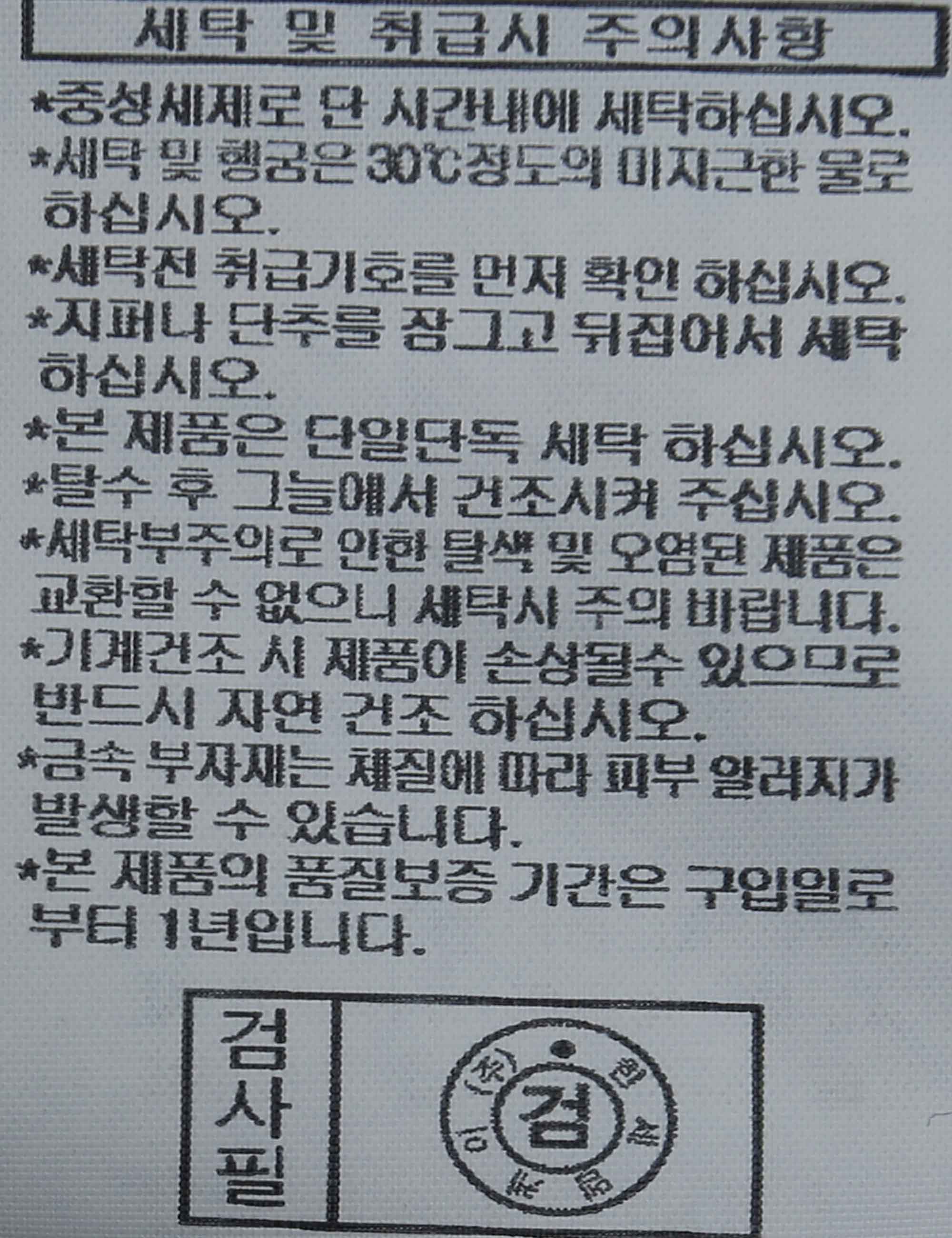 | 세탁방법 및 취급시 주의사항 | 중성세제로 단 시간내에 세탁하십시오.(케어라벨참고) |