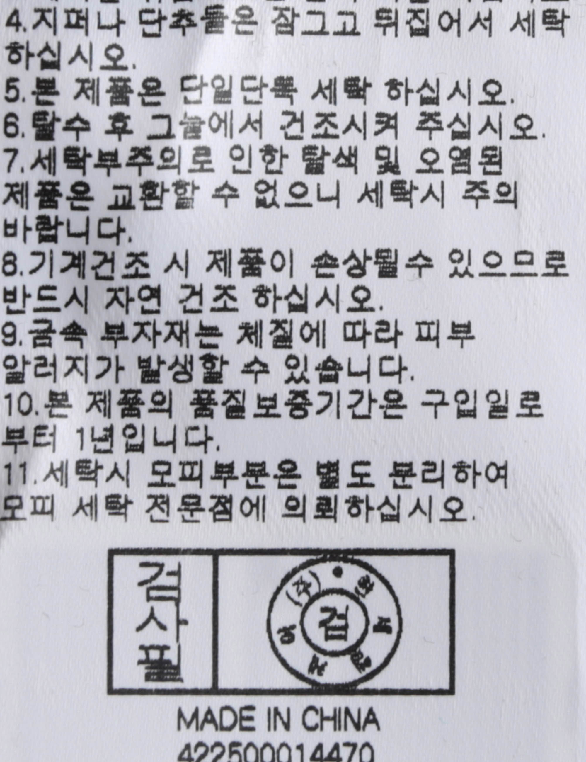 세탁방법 및 취급시 주의사항 중성세제로 단 시간내에 세탁하십시오.(케어라벨참고)