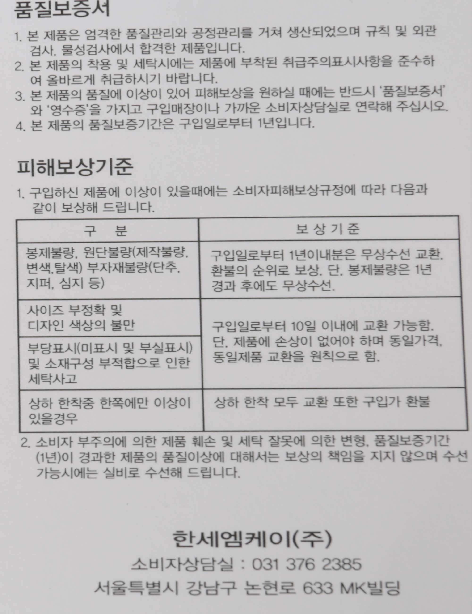 | 제조사 | 한세엠케이(주) |