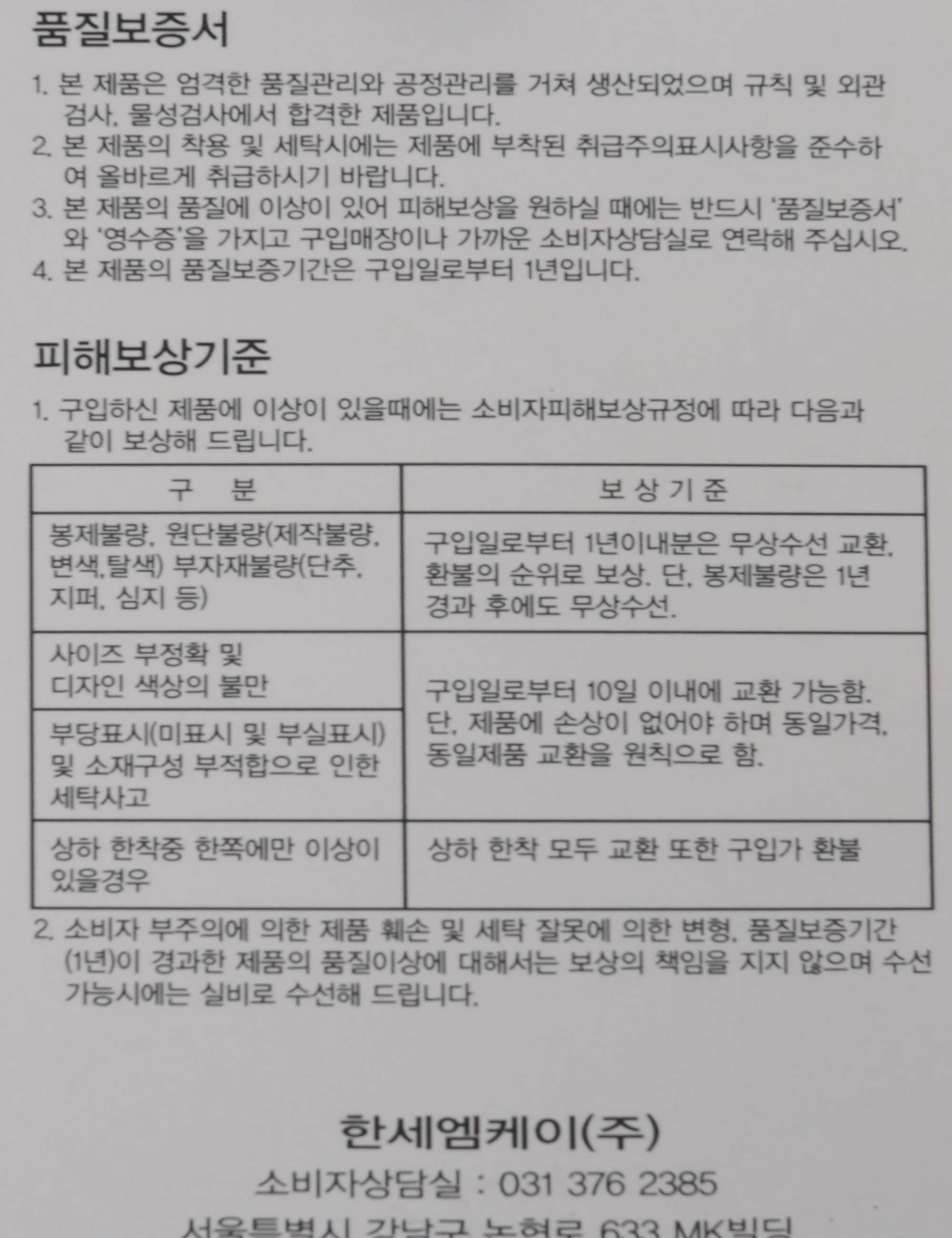 | 제조사 | 한세엠케이(주) |