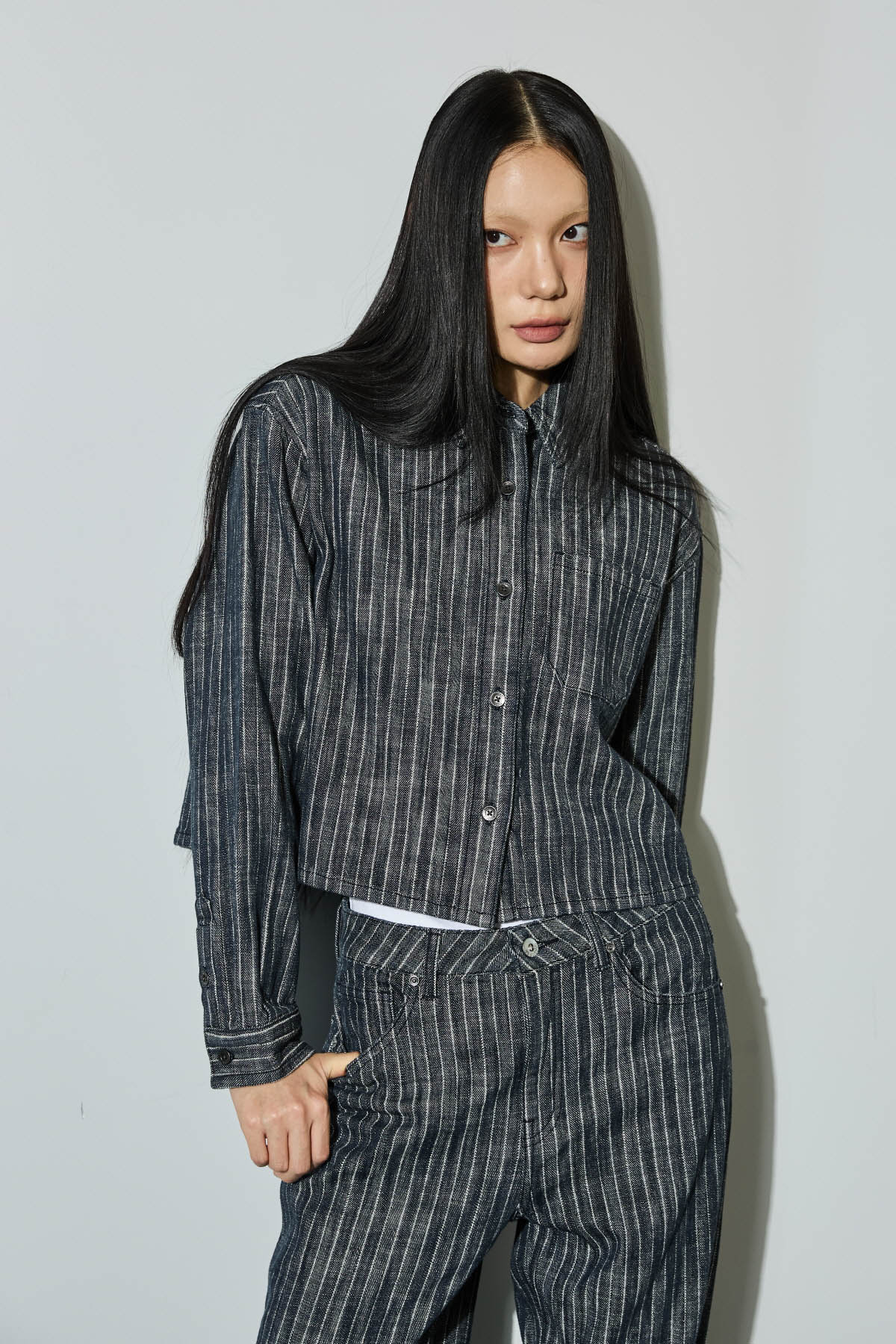 스트라이프 스트레이트 데님 팬츠와 셋업으로 함께 코디하여 연출하기 좋은 데님팬츠