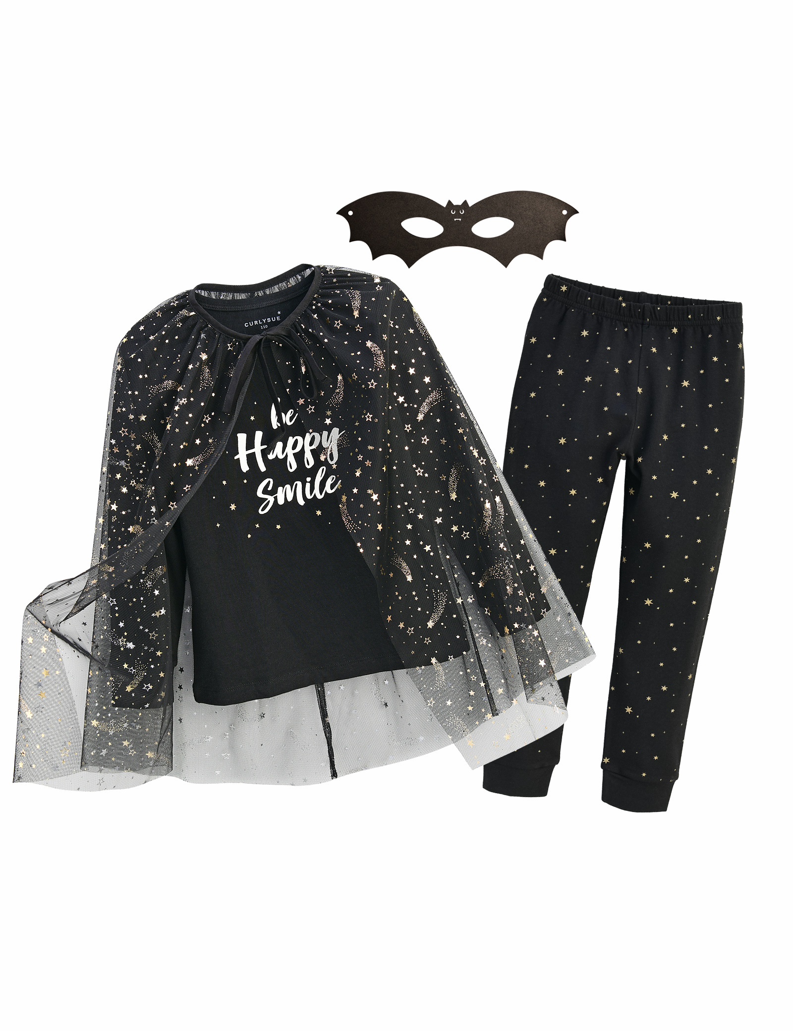 시크하고 모던한 블랙 컬러에 골드 펄 나염으로 고급스러움을 더했습니다. 반짝거리는 별호일 나염이 찍힌 망토는 아이들의 호기심과 흥미를 자극합니다. 할로윈 박스 패키지로 구성되어 할로윈 홈 파티에 활용하기 좋습니다.