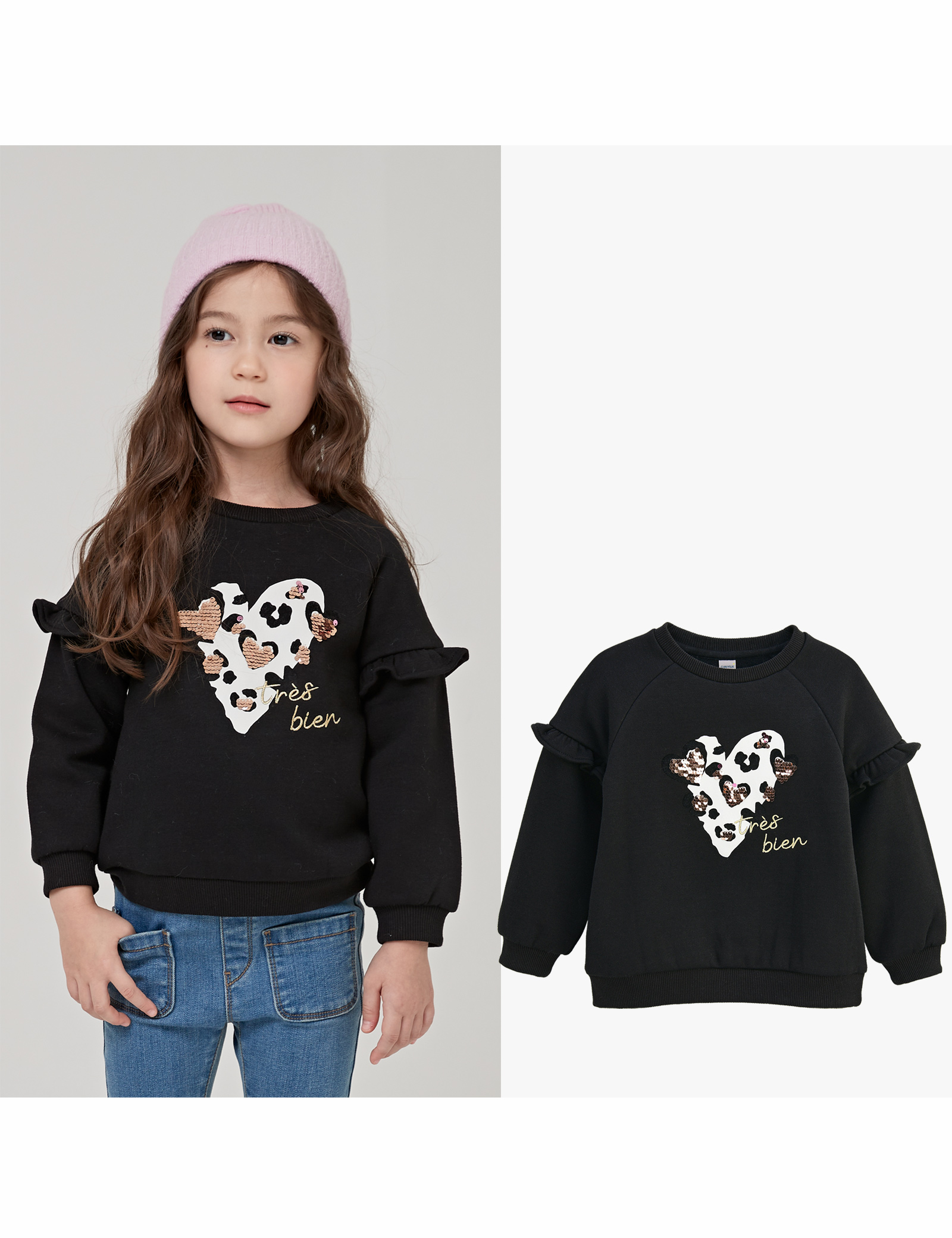 소매에 짧은 프릴이 달린 귀여운 맨투맨입니다. 안쪽이 기모로 되어있어 따뜻하게 입을 수 있습니다. 블랙 컬러에는 양면 스팽글로 포인트를 주었고, 코랄 컬러에는 체인 자수와 밍크 폼폼이로 포인트를 주었습니다.