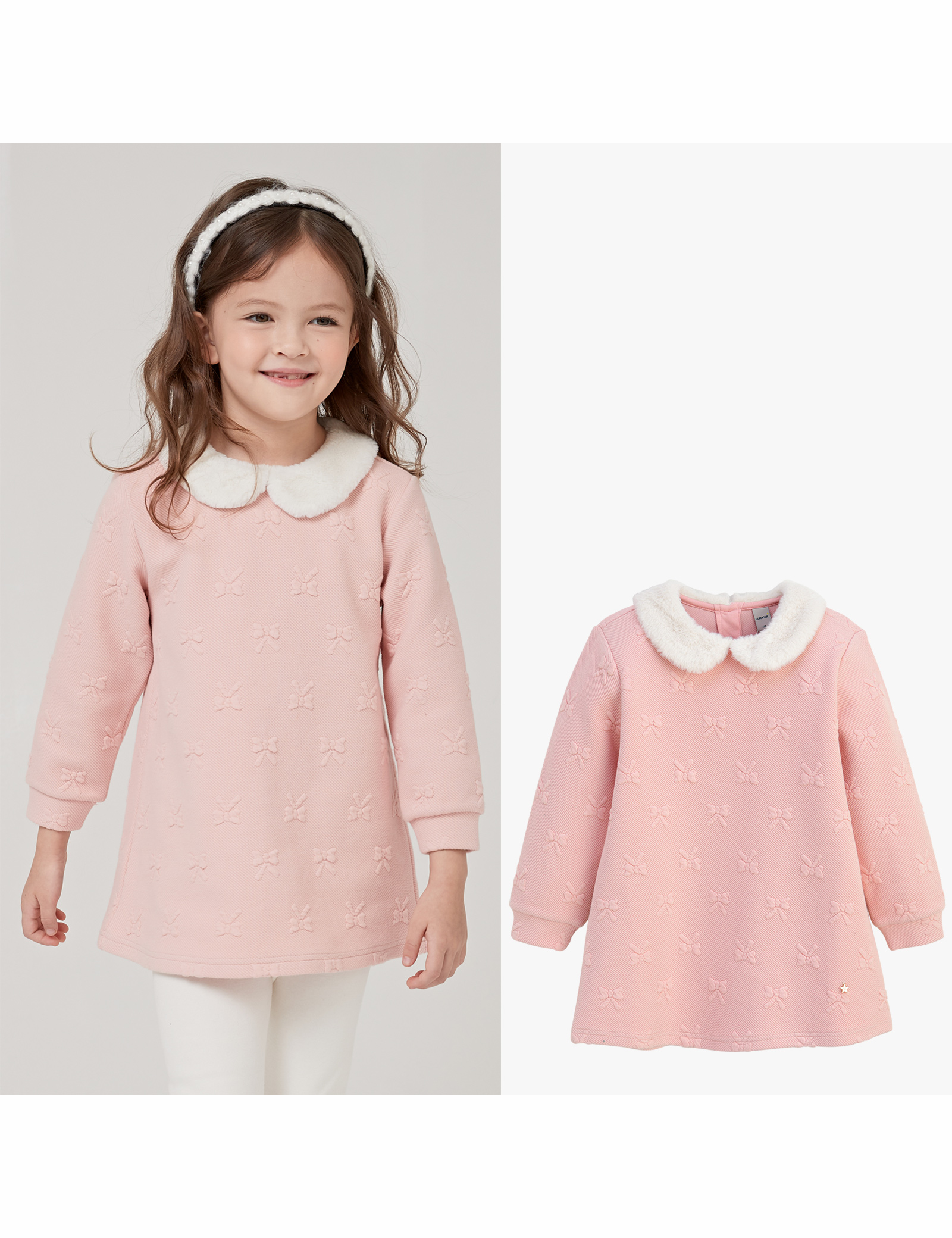 러블리한 리본과 따뜻한 퍼 애리를 포인트로 한 누비지 롱 티셔츠입니다. 도톰한 누비지 소재라 보온성도 있고 편안하게 레깅스 코디 용이하며 두 컬러 모두 소장 가치가 있어 자매 룩으로 추천드립니다.