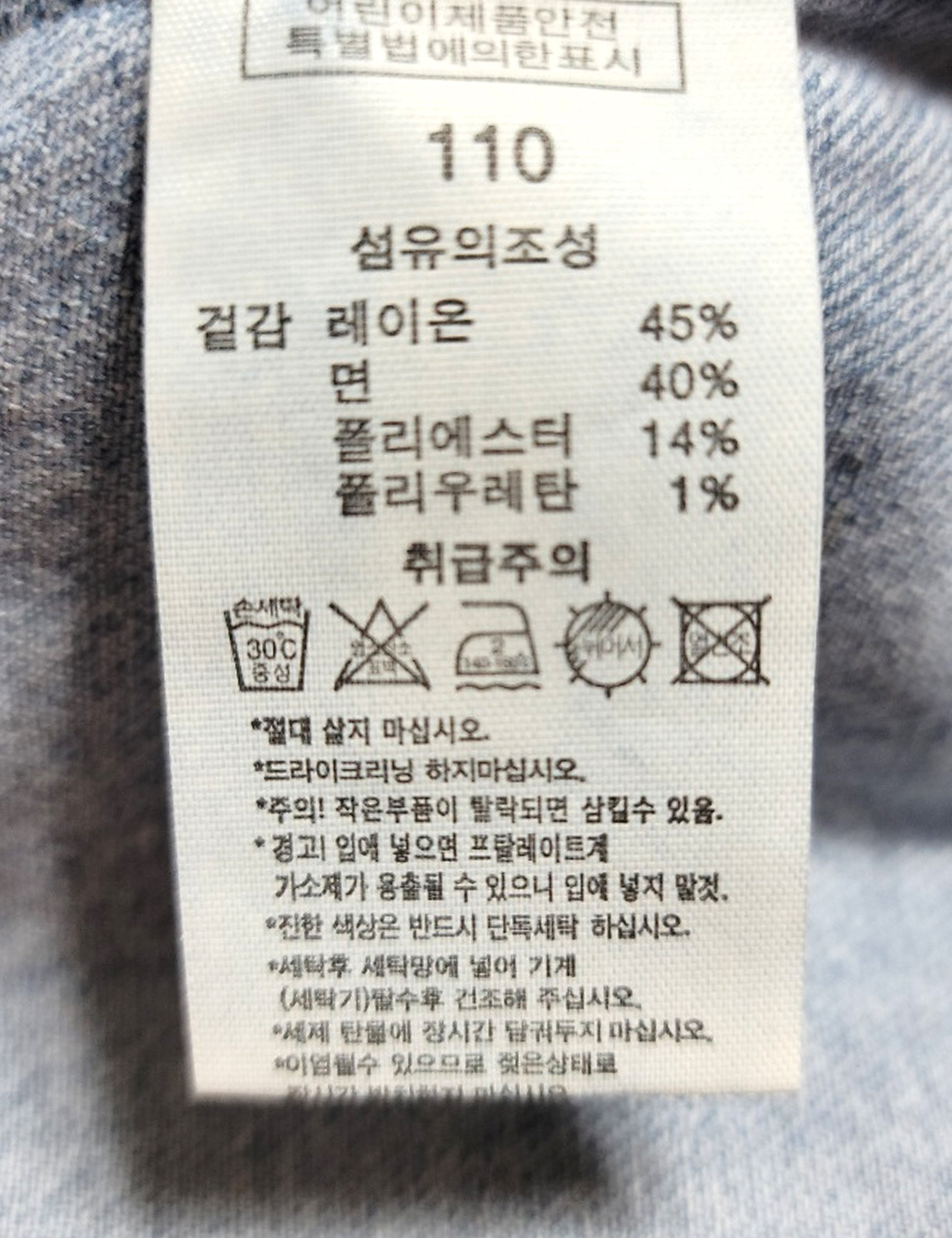 | 세탁방법 및 취급시 주의사항 | 본 세품은 손세탁 하십시오(케어라벨 참고) |