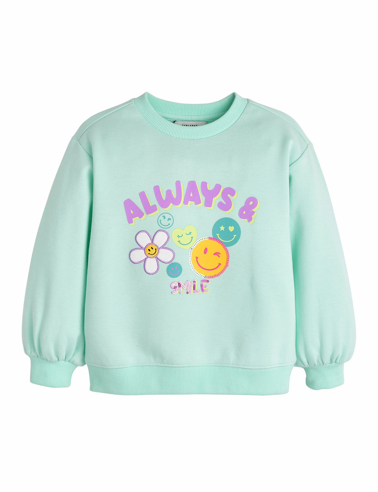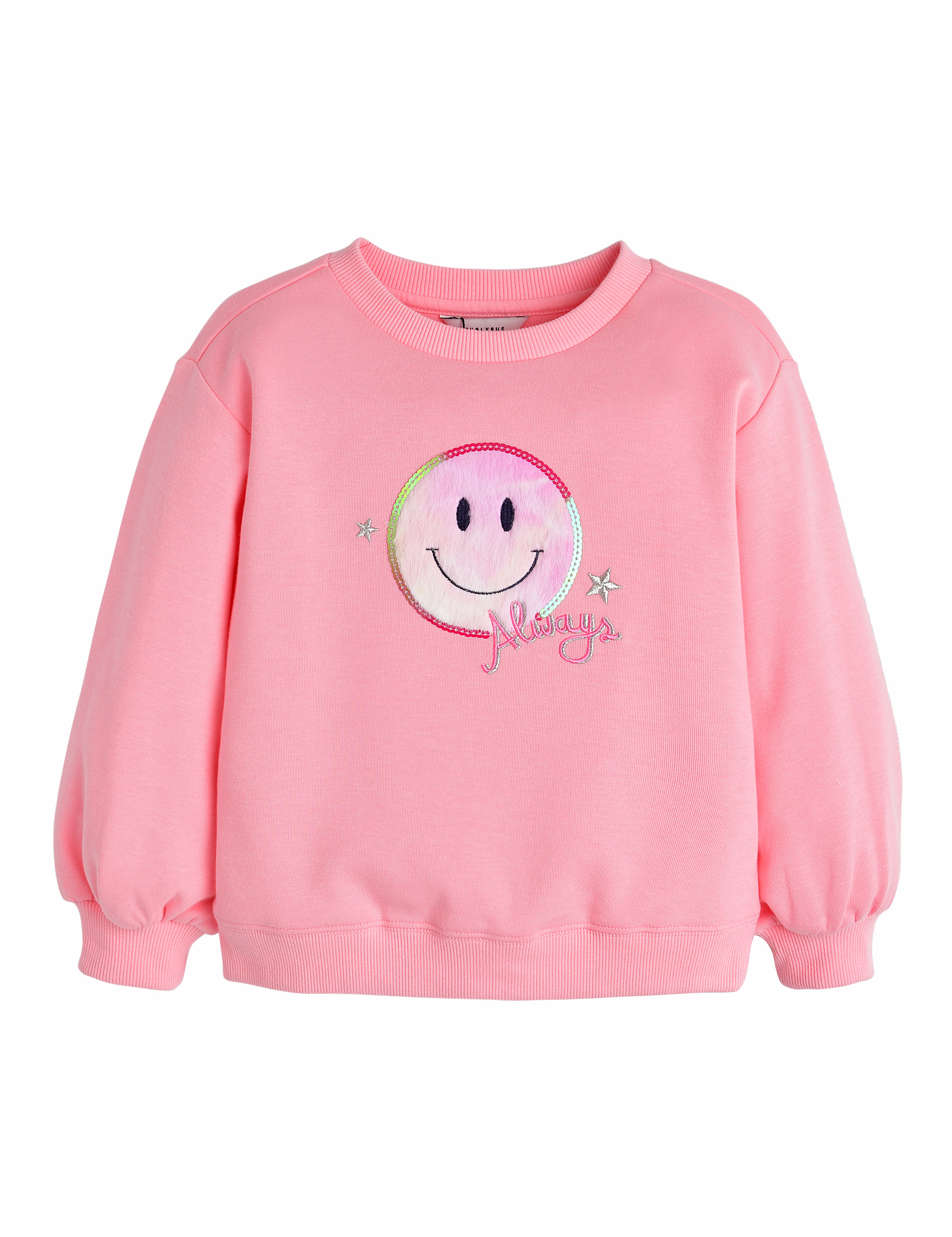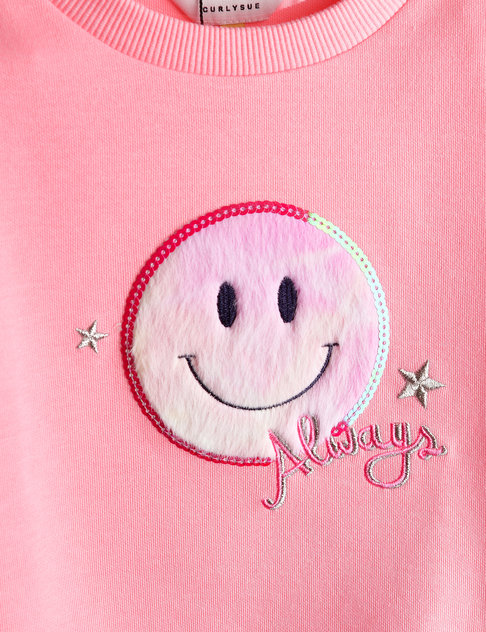 스마일 맨투맨입니다. 핑크 컬러는 중앙 에 그라데이션 퍼 원단을 사용하여 옷 마다 스마일 컬러가 다른 점이 매력적이 며 민트 컬러는 다양한 스마일에 스팽글 과 원단을 사용하여 포인트를 줬습니다.