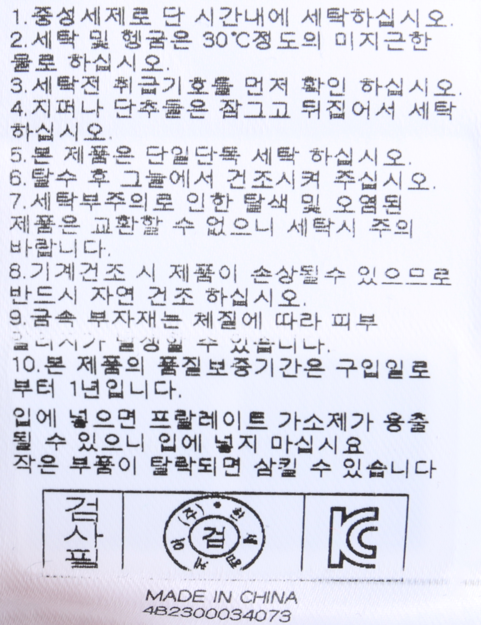 | 세탁방법 및 취급시 주의사항 | 중성세제로 단 시간내에 세탁하십시오.(케어라벨참고) |